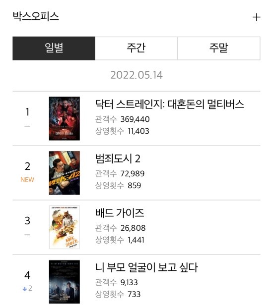 영진위 영화관입장권 통합전산망에 따르면, ‘닥터 스트레인지2’는 지난 14일 36만 9,440명의 관객을 동원했다. 누적 관객수는 461만 2,613명이다.