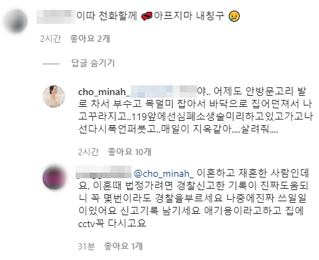 해당 글에 한 지인은 "이따 전화할게 아프지마 내 친구"라고 댓글을 남겼습니다. 이에 조민아는 "어제도 안방 문고리 발로 차서 부수고, 목덜미 잡아서 바닥으로 집어던져서 나 고꾸라졌다"며 "119 앞에선 심폐소생술 미리 하고 있고 가고 나선 다시 폭언 퍼붓고. 매일이 지옥 같아 살려줘"라고 호소했는데요.