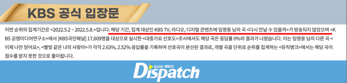 '뮤직뱅크' 관계자는 '디스패치'와의 통화에서 "임영웅 방점 결과를 받고 우리(제작진)도 놀라 재확인했다"면서 "모든 프로그램을 살폈지만 (임영웅 노래는) 방송되지 않았다"고 밝혔다.