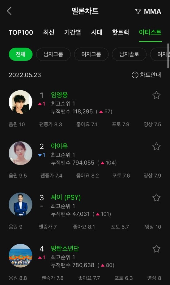 멜론 아티스트 차트는 항목별 점수를 기준으로 가중치를 부여해 최종 점수가 높은 순으로 50위를 뽑는 차트다. 집계 기간은 전일 0시부터 23시 59분까지다.