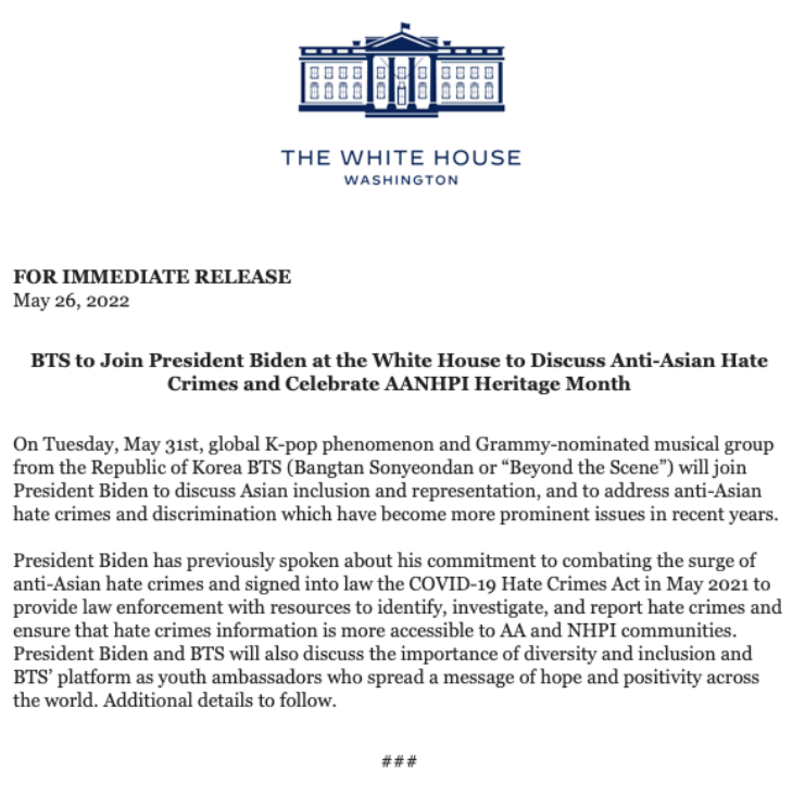 방탄소년단은 오는 31일 백악관을 찾는다. 5월은 아시아계 미국인·하와이 원주민·태평양 제도 주민(AANHPI) 문화의 달. 백악관은 이를 기념해 BTS에 방문을 요청했다.