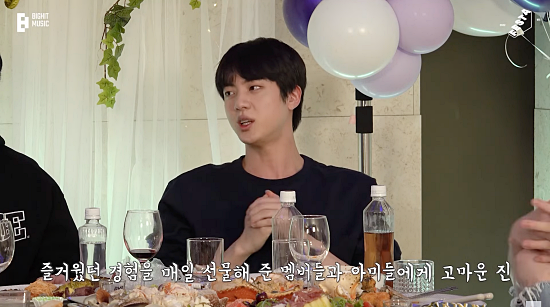 "처음엔 배우가 하고 싶었다. 배역에 따라 다양한 일을 배워볼 수 있기 때문이다. (하지만) 아이돌을 하면서 그 이상의 많은 것을 경험할 수 있었다. (확실하지는 않지만) 당장은 마음이 없다. 아이돌로 겪은 많은 경험들이 즐거웠다. 더 즐거울 예정이다. 좋은 팀을 만났기에 앞으로도 더 (많은) 경험을 하면 좋겠다. 우리 아미 여러분 덕분에 할 수 있어 감사하다는 말을 하고 싶다" (진)