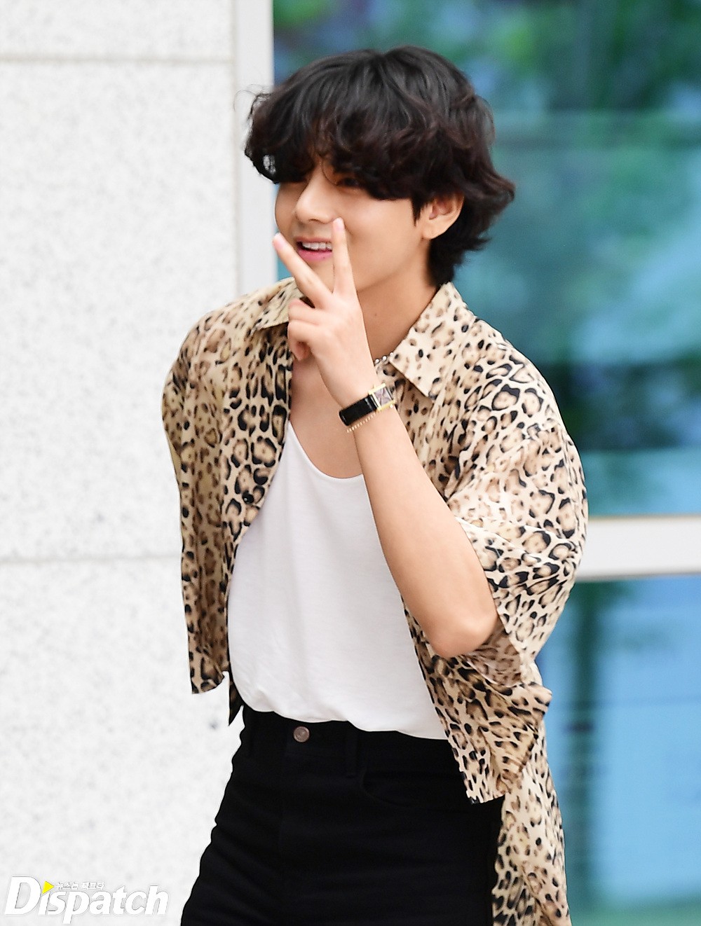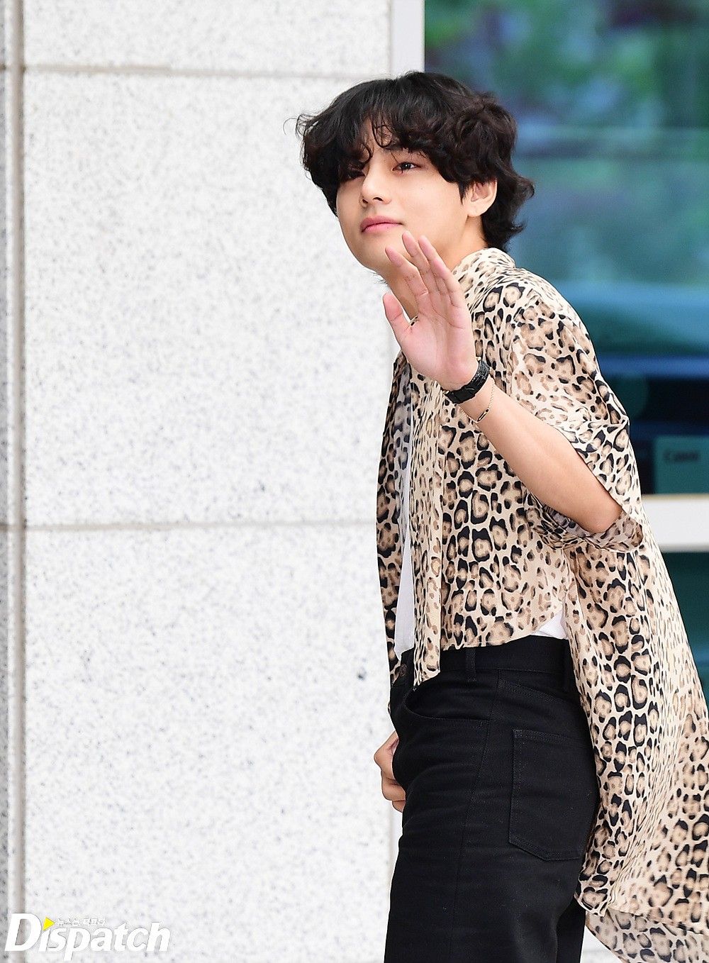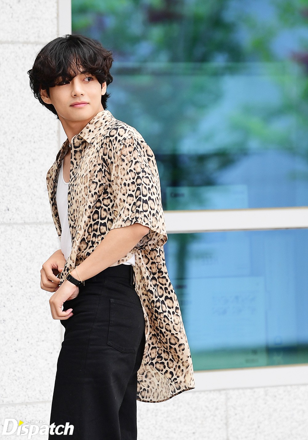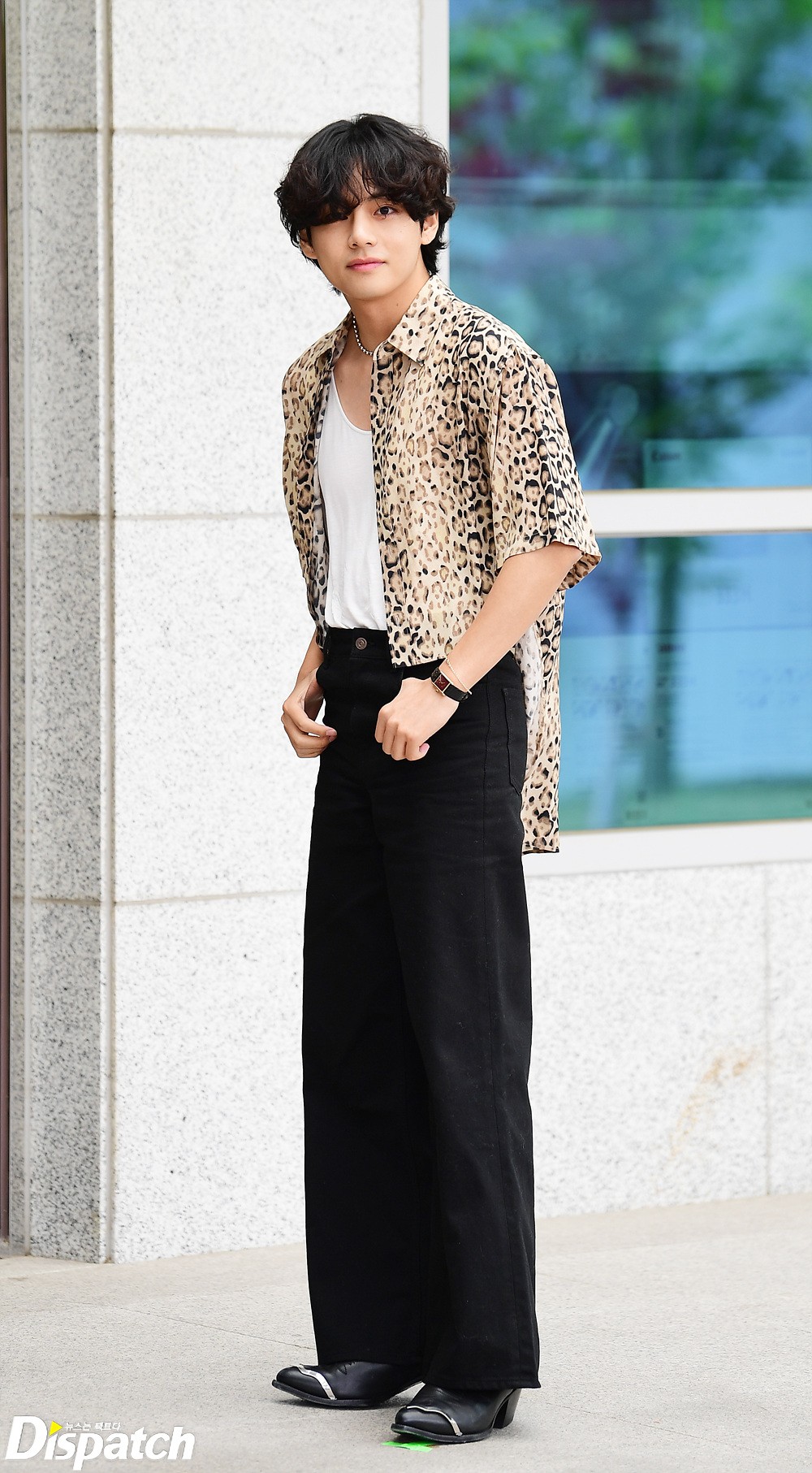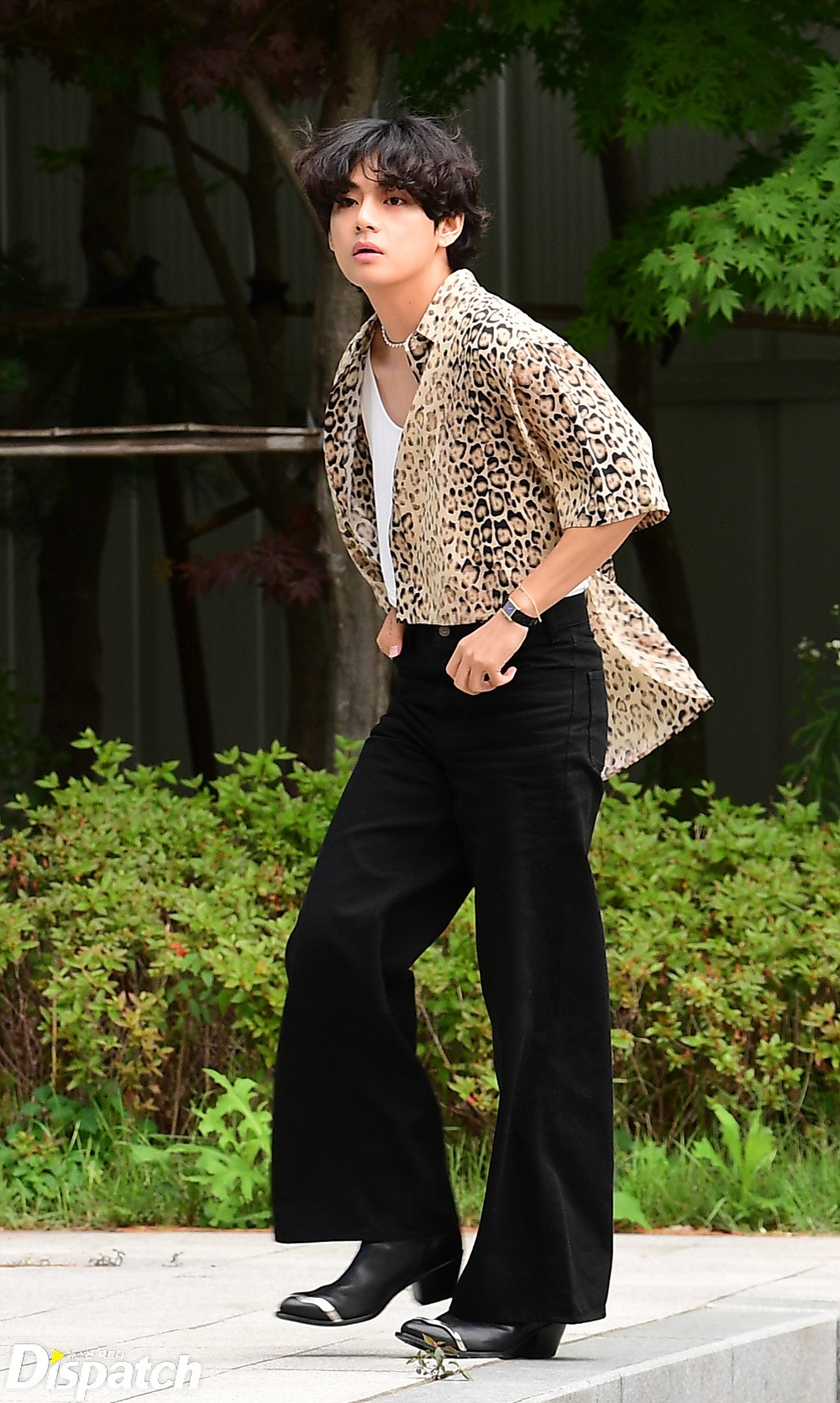 뷔는 이날 레오파트 셔츠에 블랙 와이드 팬츠로 패셔니스타의 스타일을 선보였다.