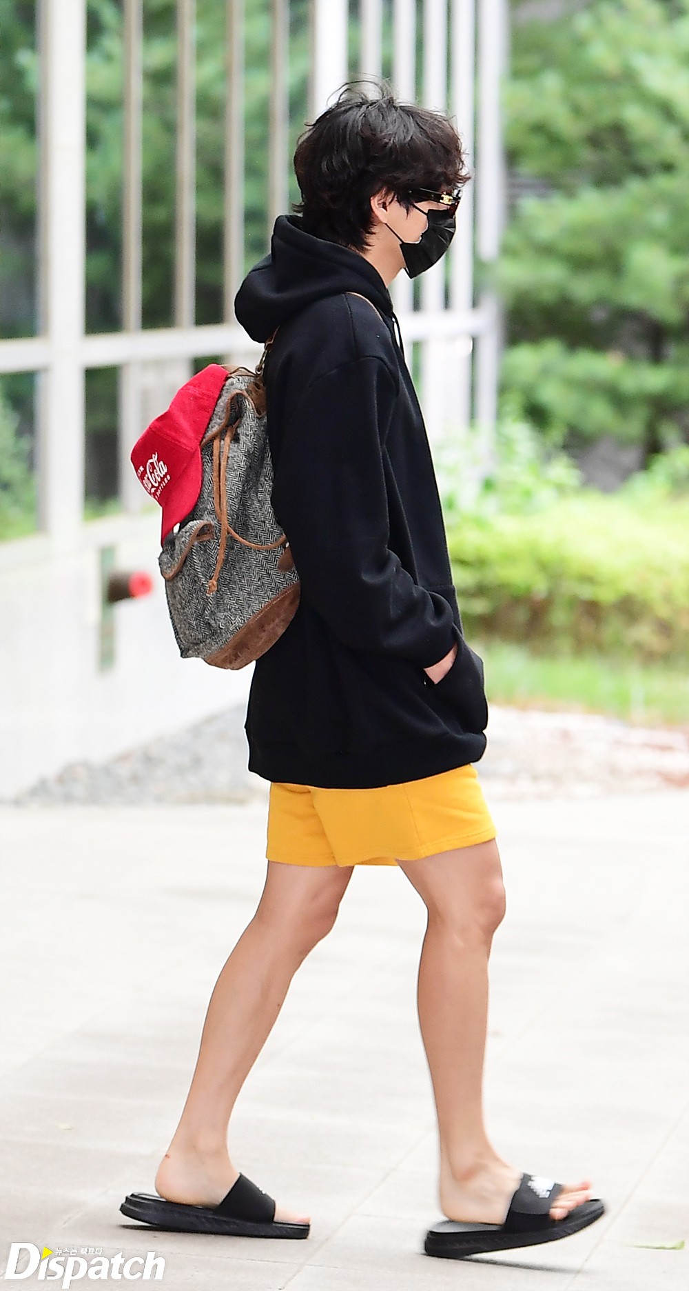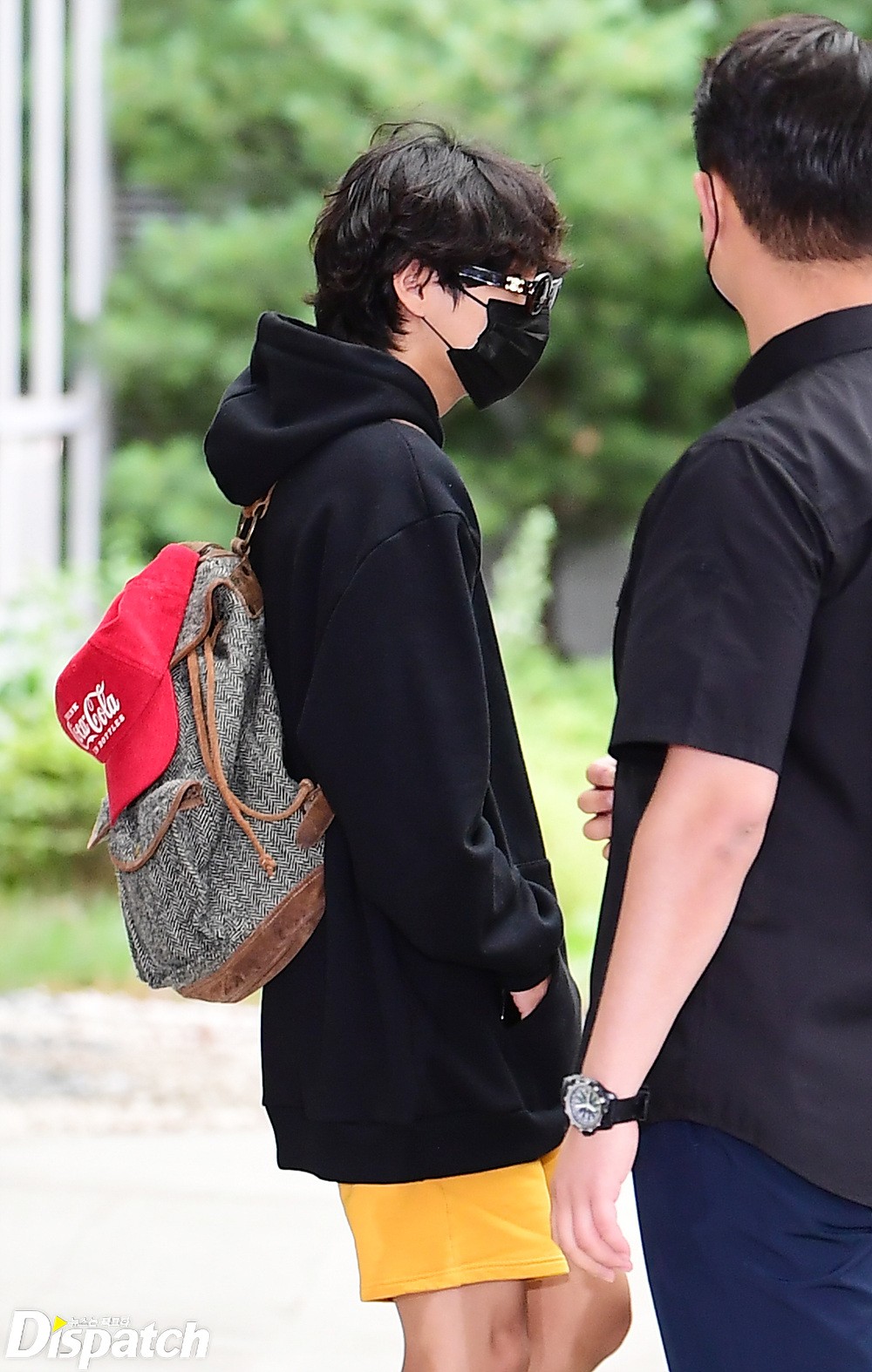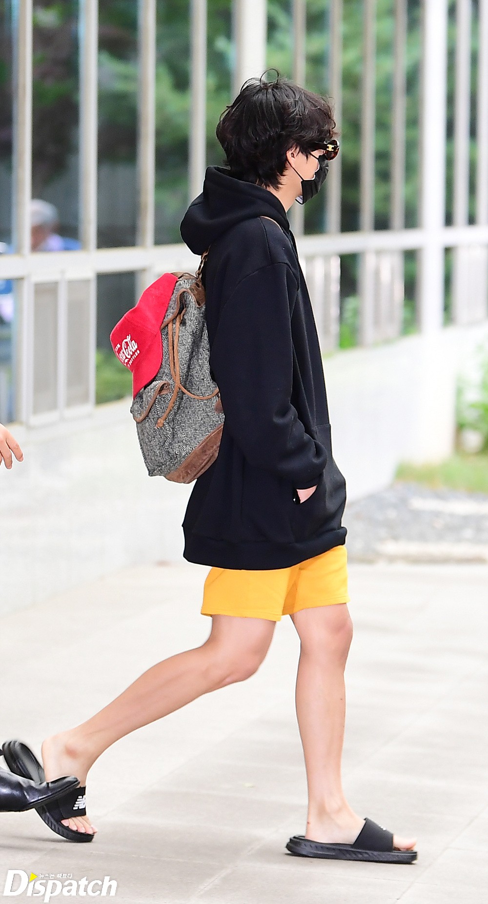 뷔는 블랙 컬러의 후드집업과 반바지, 슬리퍼로 편안한 공항패션을 연출했다. 장시간 비행에 다소 지친 모습이였다.