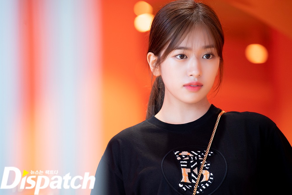 안유진은 베이식한 블랙 티셔츠와 미니 스커트를 매치해 청순한 매력을 드러냈다.