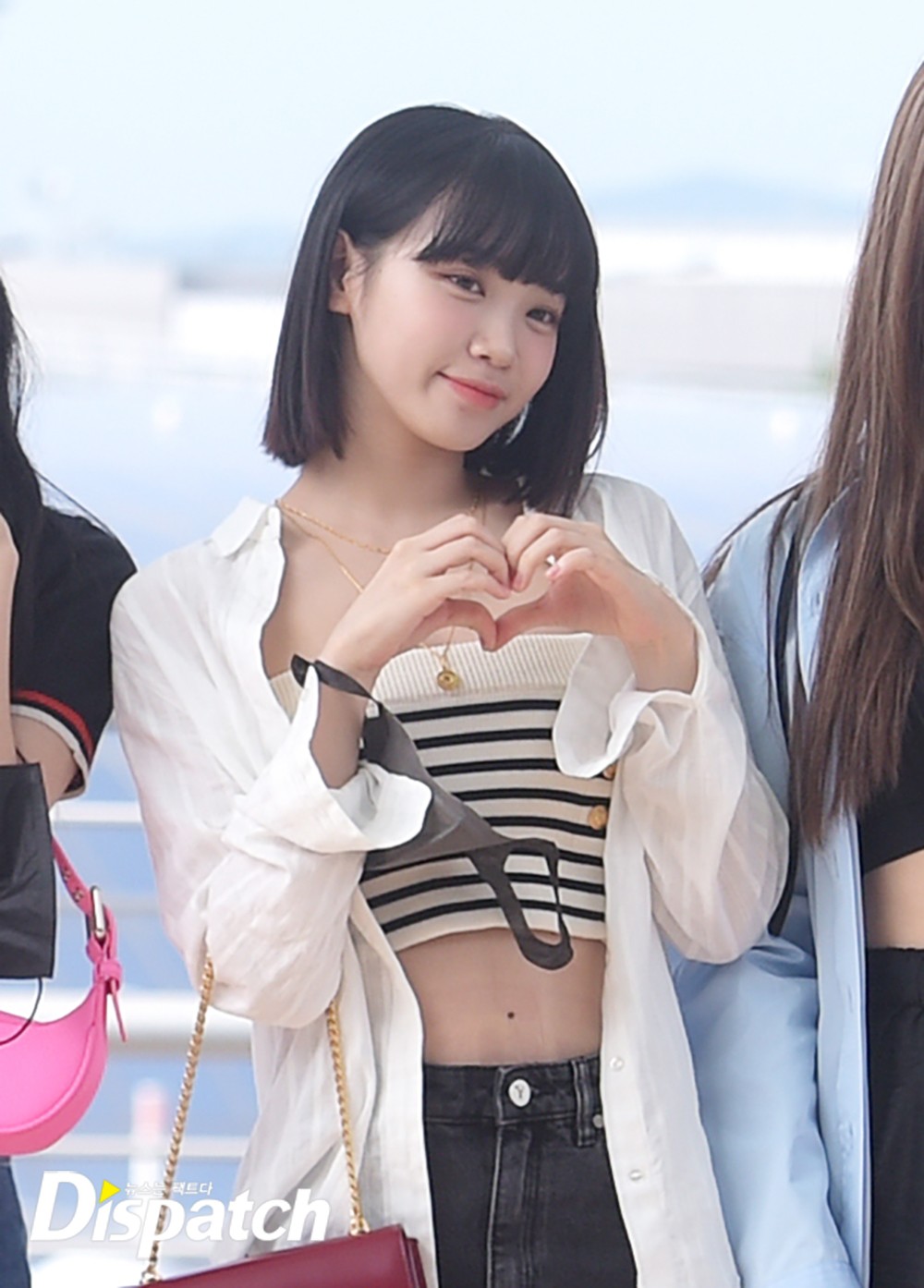 김채원은 눈부신 미모로 취재진의 시선을 사로 잡았다. 공항에 모인 팬들에게 사랑스러운 포즈로 화답했다.