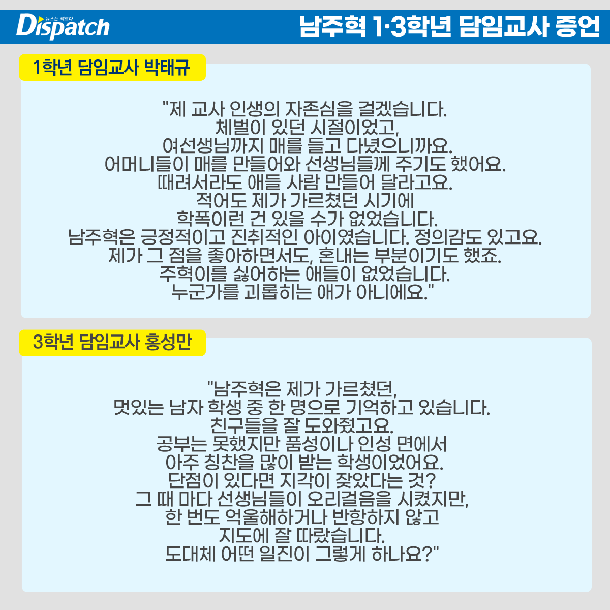 "아니 땐 굴뚝에 연기 났다는 댓글을 봤어요. 정말 공감이 됐죠. 남주혁은 긍정적이고 진취적인 아이였습니다. 정의감도 있고요. 제가 그 점을 좋아하면서도 혼내는 부분이기도 했죠. 주혁이를 싫어하는 애들이 없었습니다. 누군가를 괴롭히는 애가 아니에요. 제 증언, 얼마든지 쓰셔도 됩니다. 그만큼 자신있으니까요." (박태규)