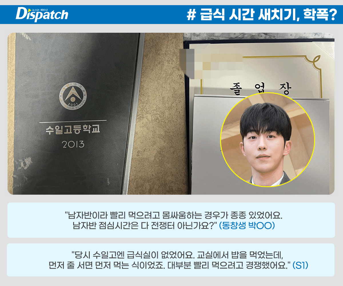 동창생 박OO은 "남자반이라 빨리 먹으려고 몸싸움을 하는 경우가 종종 있다"면서 "남자반 점심시간은 다 전쟁터다. 우리 반에서도 늘 일어나는 일이었다"고 말했다.