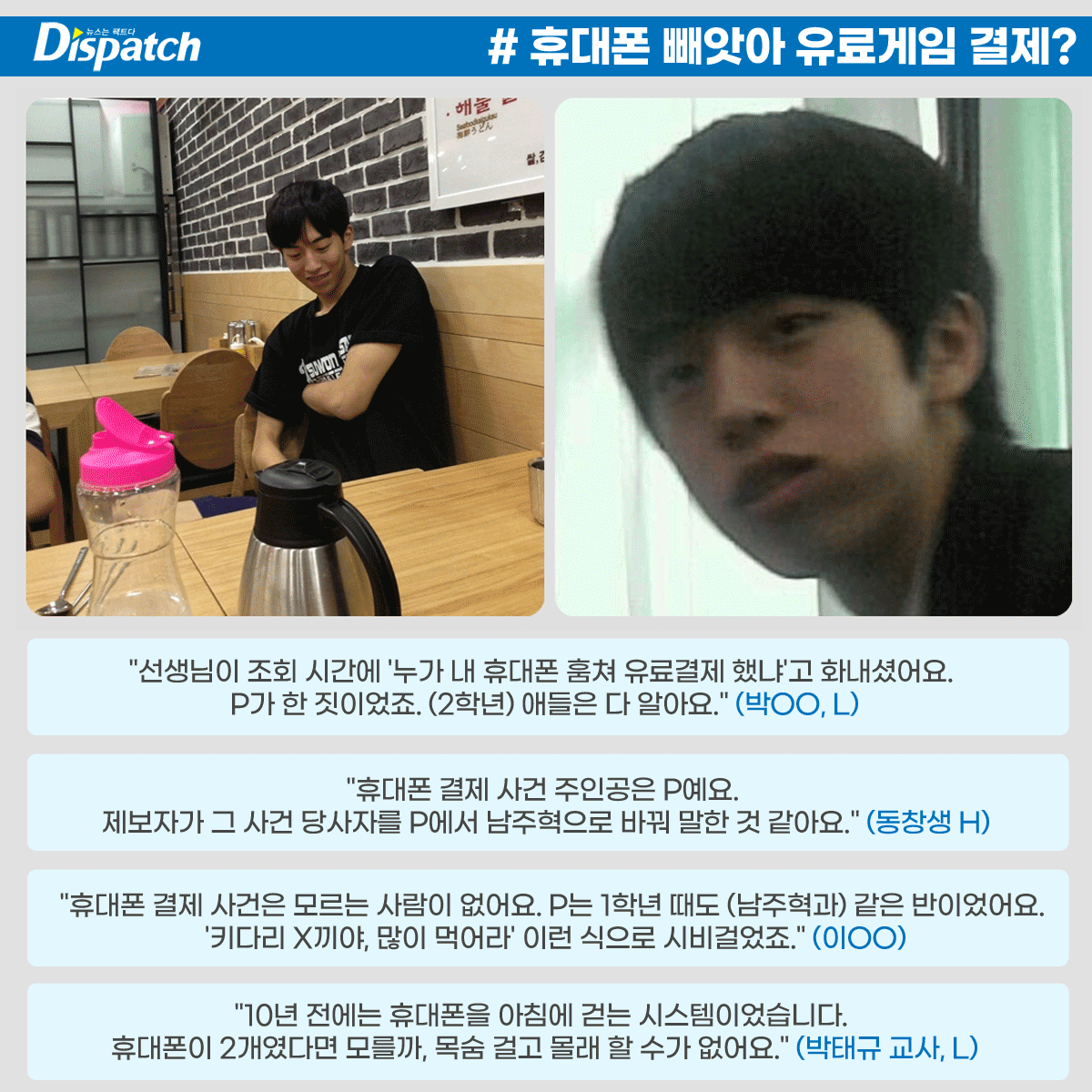 "남주혁이 남의 폰으로 유료 결제를 했다고요? 오히려 P가 선생님 휴대폰을 훔쳐서 결제하다 걸렸죠. 선생님이 조회 시간에 '누가 자기 휴대폰으로 유료 결제를 했다'고 혼내셨어요." (박OO)
