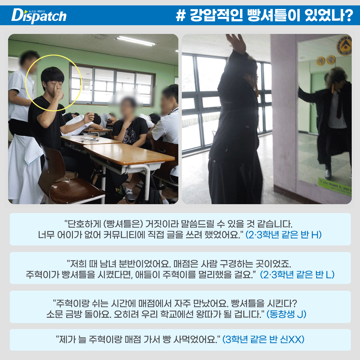 신XX(3학년 같은 반)씨는 일명 '빵밍아웃'을 했다. "내가 주혁이랑 늘 매점에 가서 빵을 사먹었다"며 "누굴 시키고 그런 일이 없었다. 우리가 직접 매점에서 사서 먹었다"며 헛웃음을 지었다.