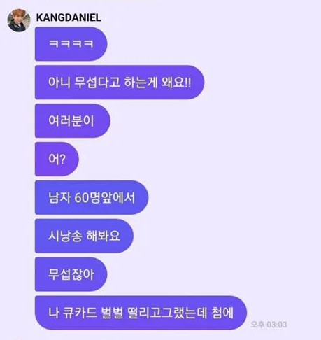 강다니엘은 "무섭다고 하는 게 왜요. 여러분이 남자 60명 앞에서 시낭송 해봐라. 무섭지 않냐. 나 큐카드 벌벌 떨리고 그랬는데 처음에. 화장도 아이라인 뽝하신 누님들이다"라고 설명했죠.