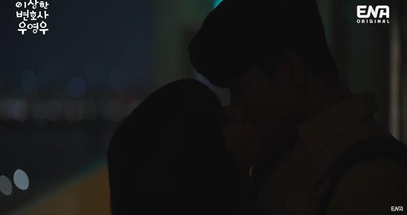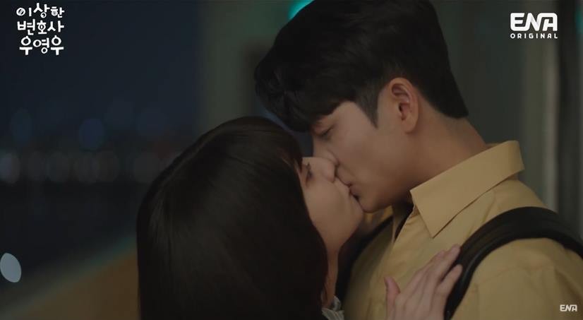 28일 오후 방송된 ENA '이상한 변호사 우영우' 10회 엔딩에서는 첫 키스를 나누는 우영우(박은빈 분)와 이준호(강태오 분)의 모습이 그려졌습니다.