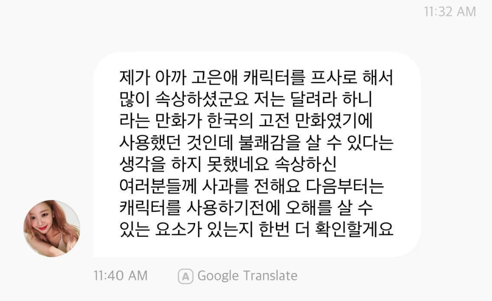 팬들에게 "제가 아까 고은애 캐릭터를 프사로 해서 많이 속상하셨군요"라며 사과 글을 올렸습니다.