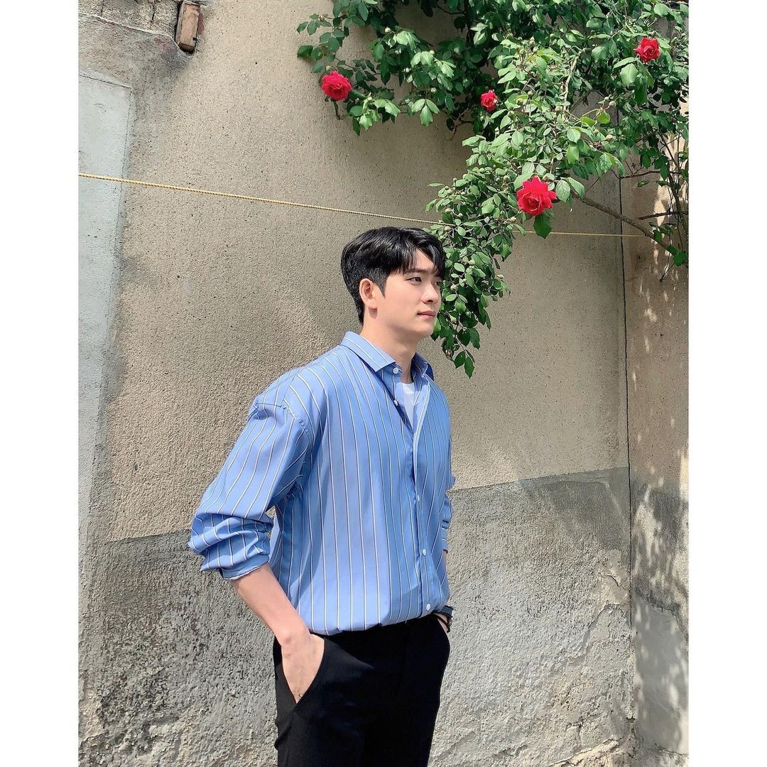 강태오가 대본을 읽고 있는 사진과 장미 앞에서 찍은 사진이었는데요. 그는 하늘색 스트라이프 셔츠를 입고 있죠. 화사하고 시원한 분위기를 자아냈습니다.