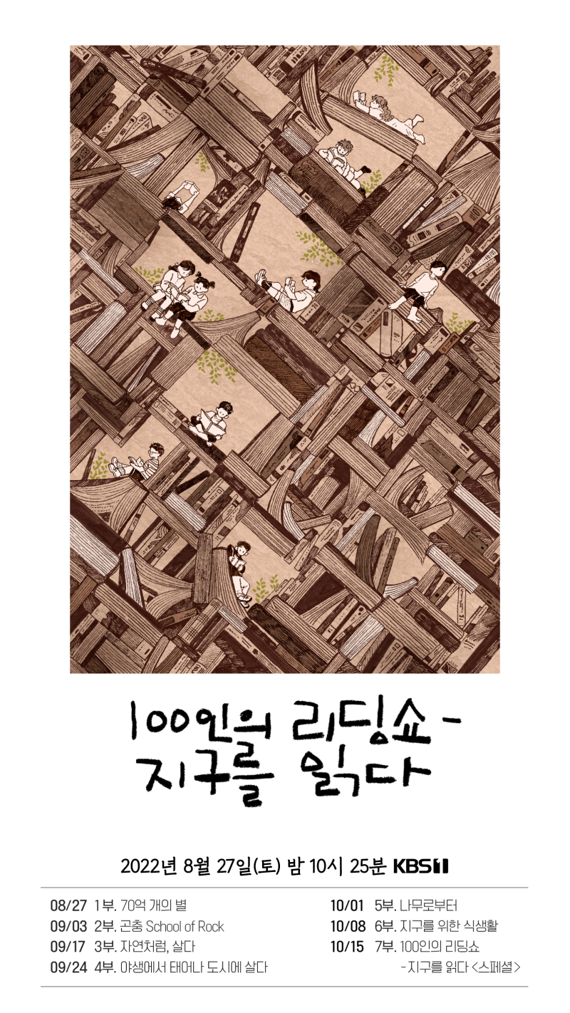 ‘100인의 리딩쇼’는 독서 다큐멘터리다. 자연과 인간의 공존에 대해 통찰한다. 책 읽기와 다큐멘터리를 결합한 프로그램이다. 새로운 형식으로 지구 살리기에 앞장선다.
