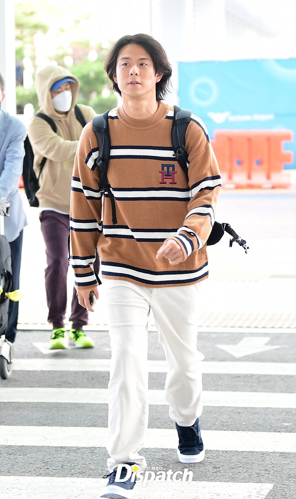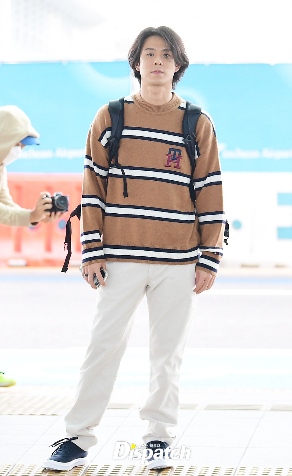 빈지노는 스트라이프 스타일의 니트와 면바지로 캐주얼한 공항패션을 연출했다. 해맑은 미소로 출국장을 나서는 모습이였다.