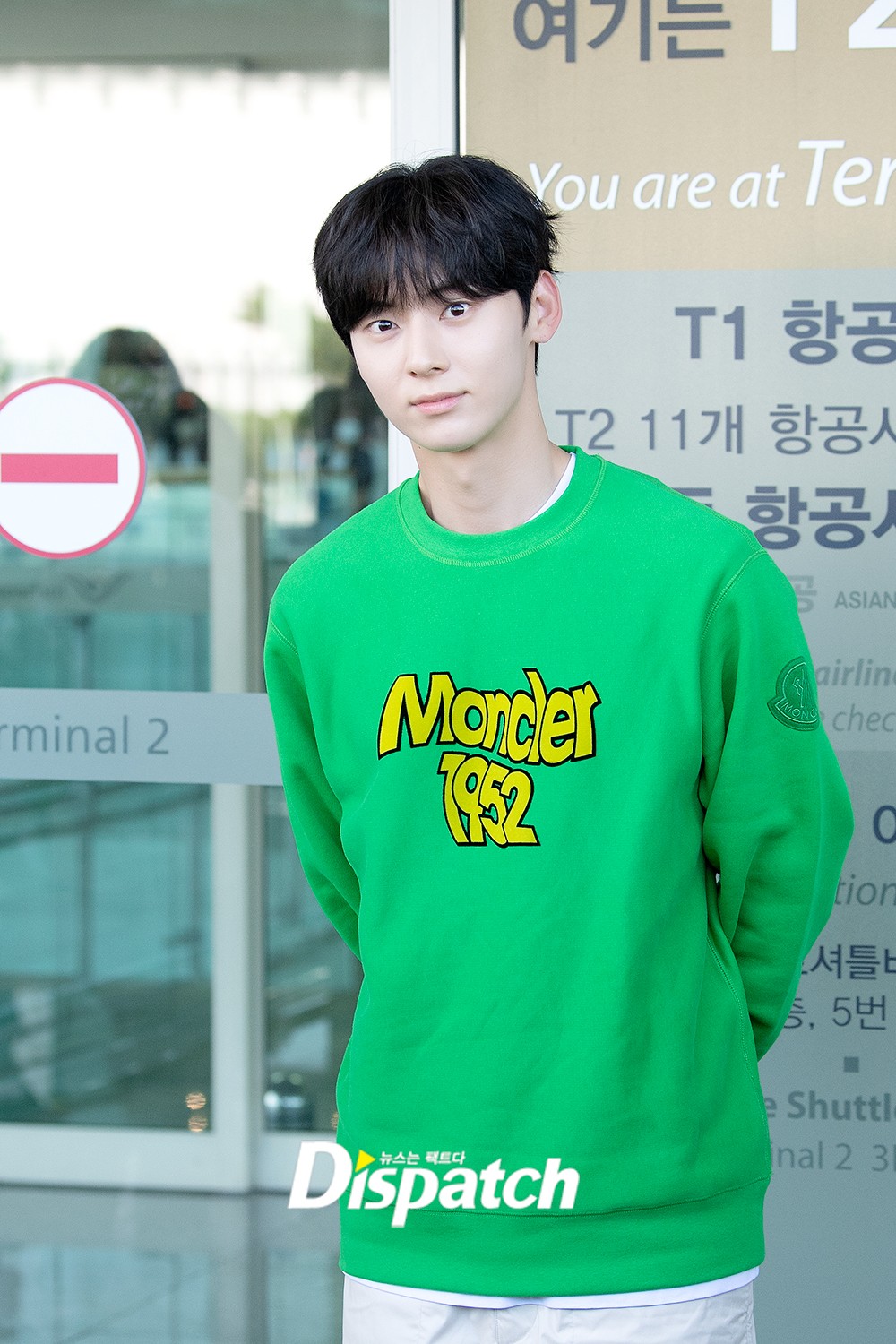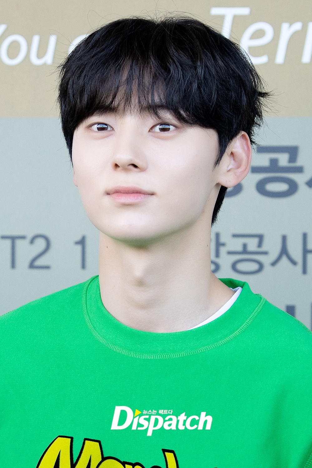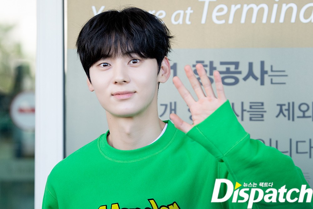 황민현은 이날 베이지 팬츠에 그린 맨투맨 티셔츠를 매치해 댄디한 공항패션을 연출했다. 조각같은 비주얼이 돋보였다.