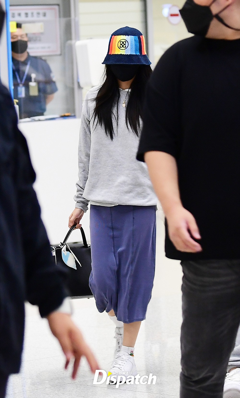 제니는 버킷햇과 맨투맨, 롱 스커트를 매치했다. 심플한 공항패션으로 입국장을 나섰다.