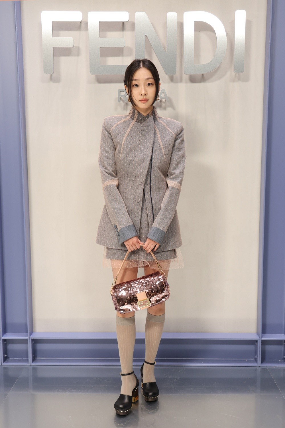 여기에 그레이 롱 삭스를 신고, 검정색 통굽 슈즈로 마네킨 포스를 뿜어냈습니다. 패션의 마무리는 백. 화려한 스팽글의 핑크 시퀸 바게트 백을 들었습니다.