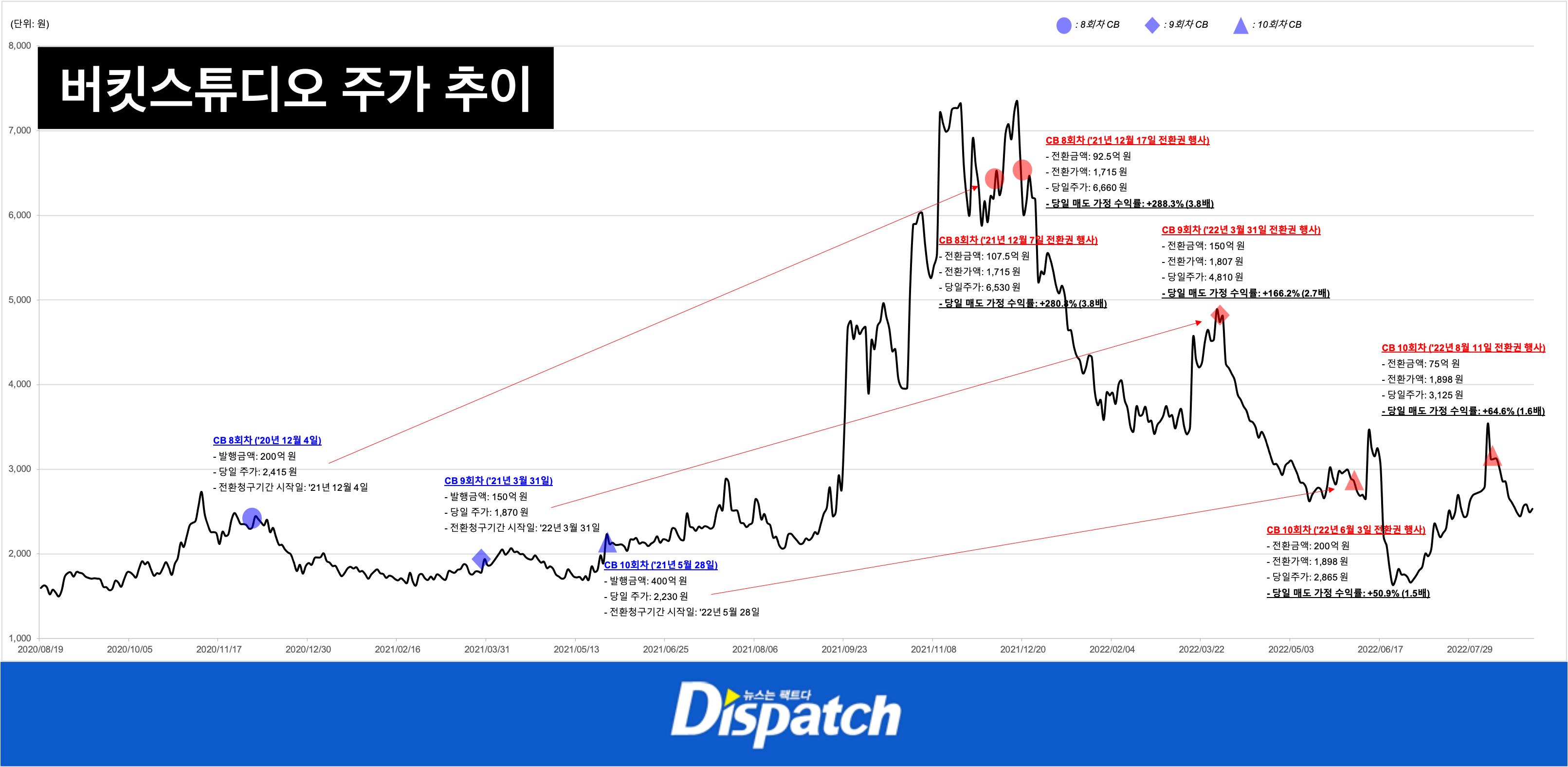 ‘디스패치’는 전환권 행사 당일의 주가와 전환가액을 분석했다. 버킷스튜디오 CB의 경우, 8회차 284%, 9회차 166%, 10회차 55% 이상의 수익(종가 기준)을 기록했다.