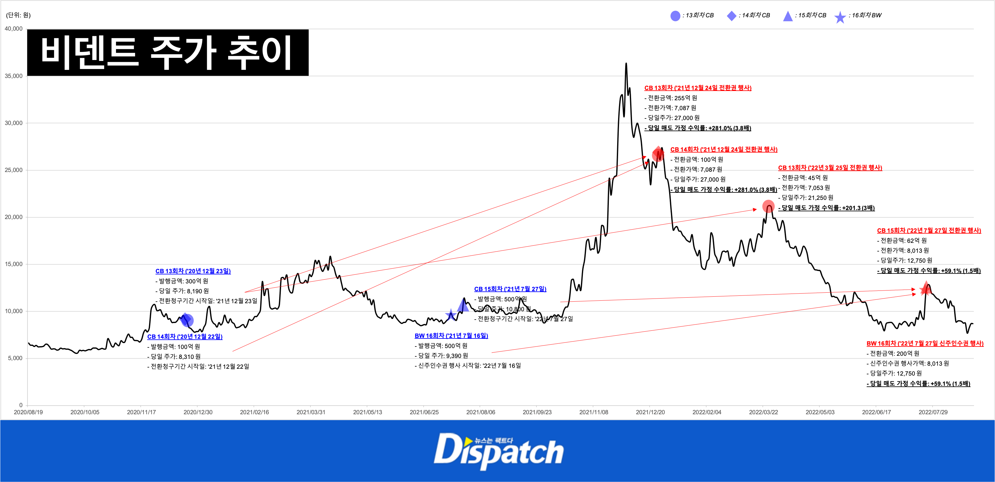 비덴트는 2021년 7월, CB(15회차)와 BW(16회차) 1,000억 원어치를 발행했다. 전환가액은 8,013원. 참여자들은 2022년 7월 27일, 1만 2,800원 이상에서 주식을 털 수 있었다.