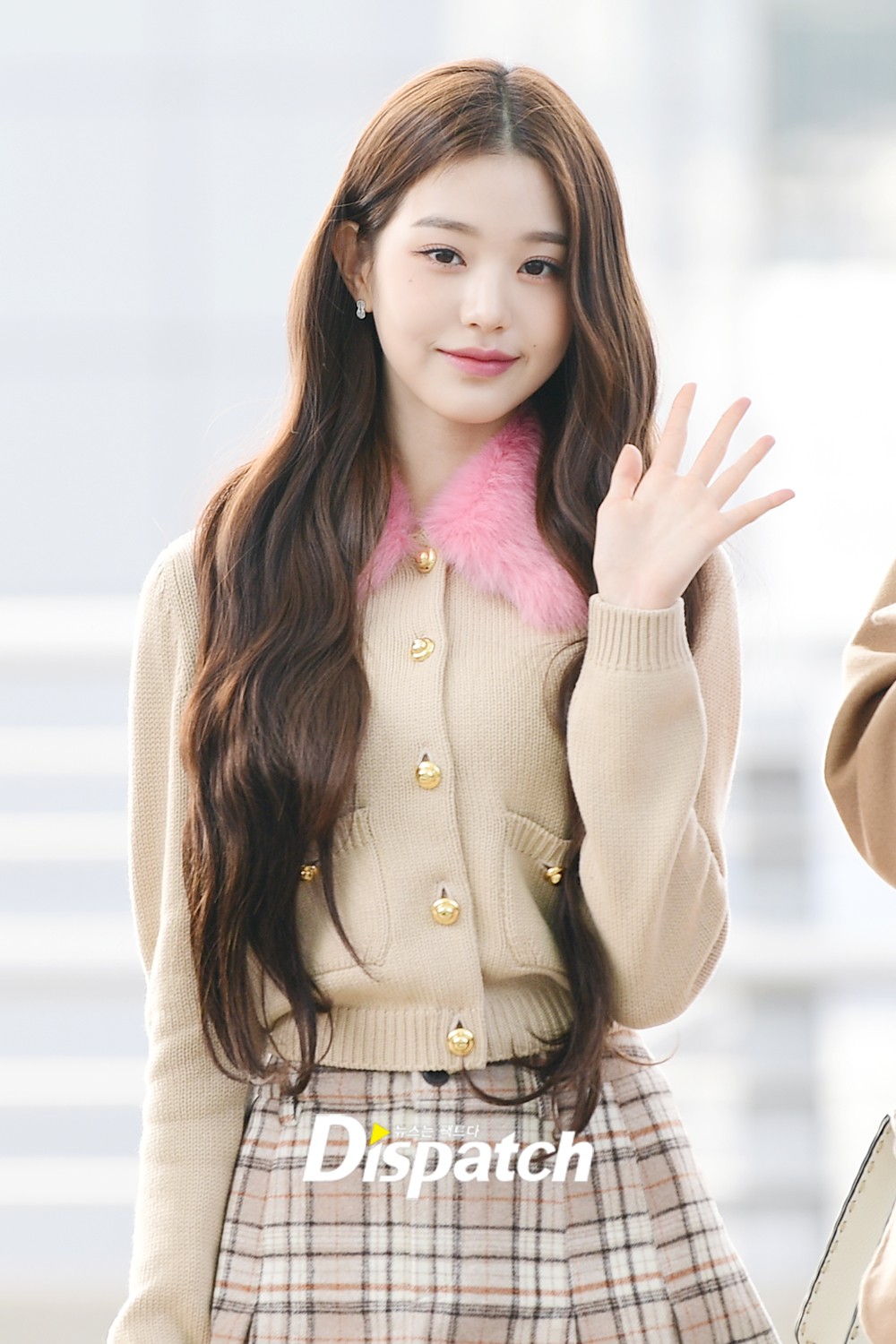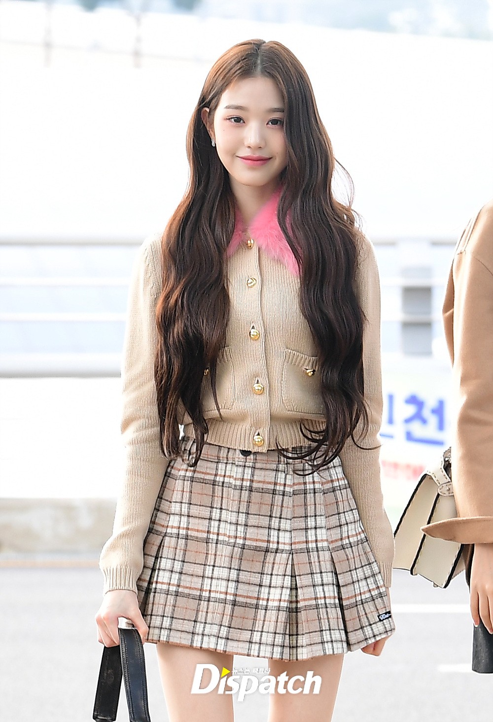 장원영은 베이지색 카디건에 체크무늬 스커트를 매치했다. 러블리한 매력이 시선을 끌었다.