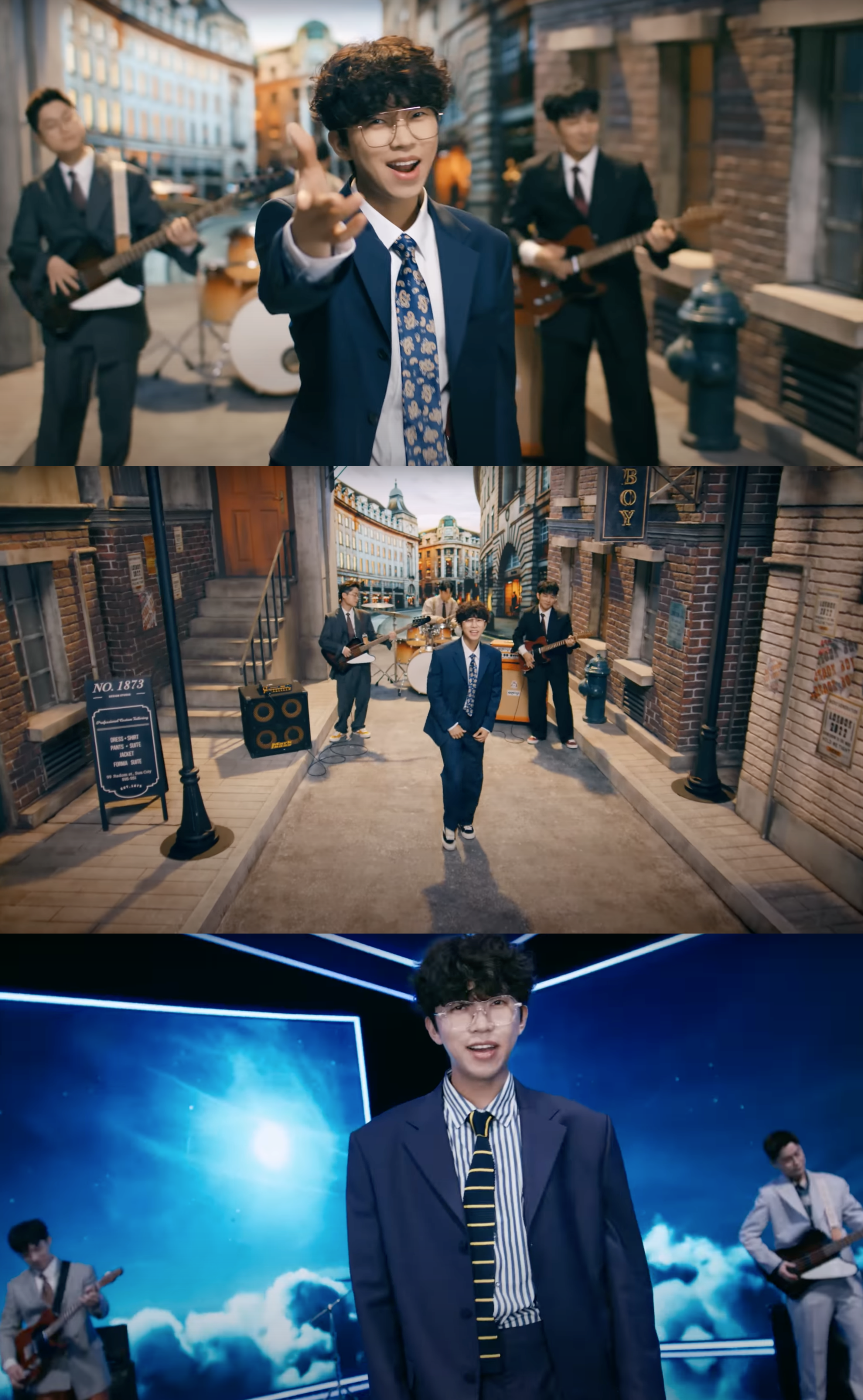 영국 댄디가이로 변신했다. 임영웅은 밴드의 보컬로 등장했다. 뽀글뽀글한 머리와 캐주얼한 수트로 귀여운 매력을 뽐냈다.