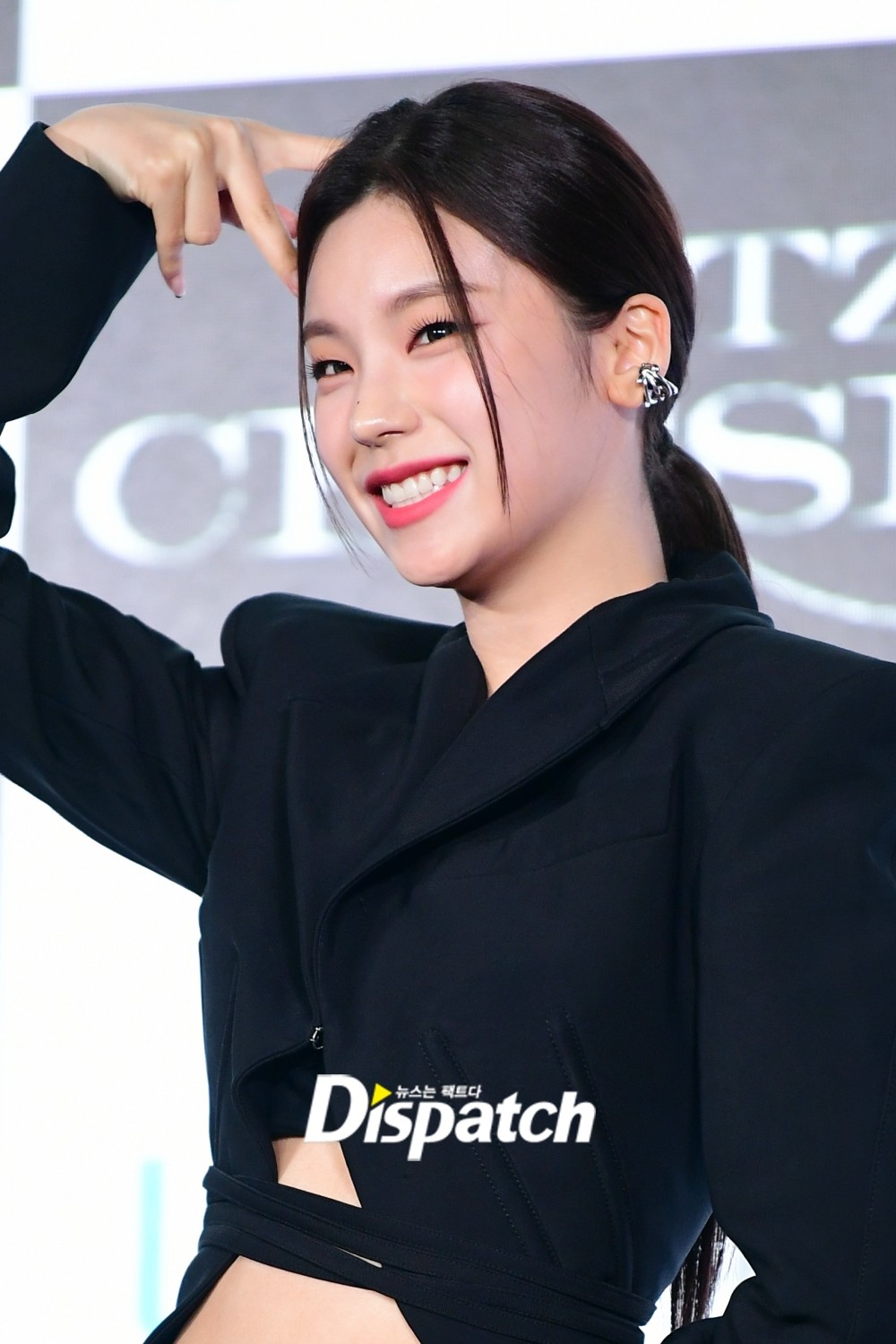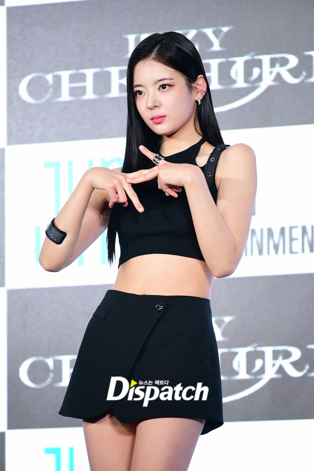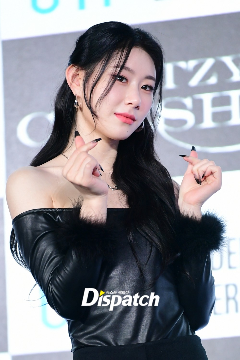 있지는 올블랙룩으로 시크한 섹시미를 완성했다. 하트 포즈로 상큼미를 더했다.