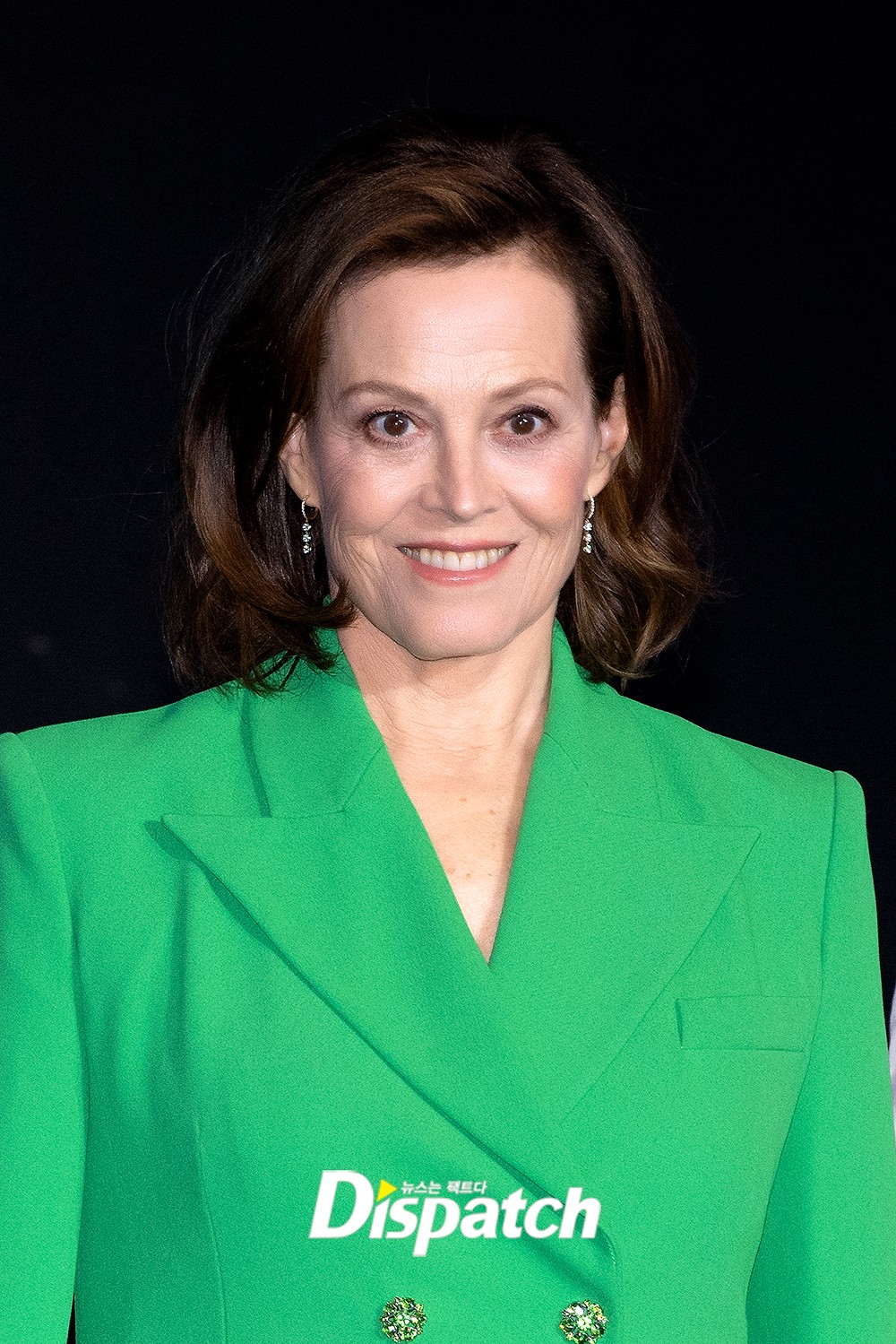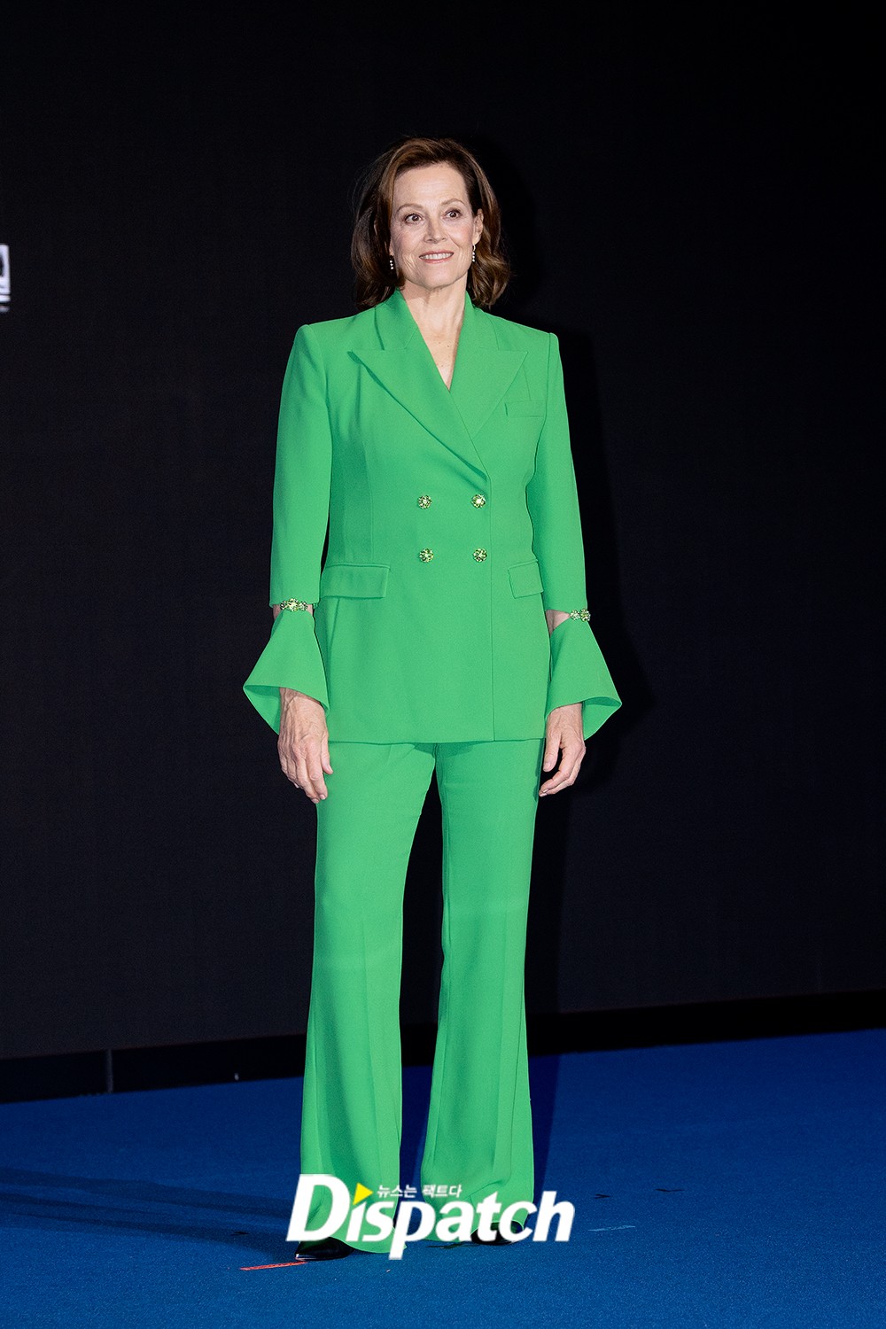 시고니 위버는 이날 그린 수트로 우아한 분위기를 뽐냈다. 해맑은 미소로 포토타임을 가졌다.