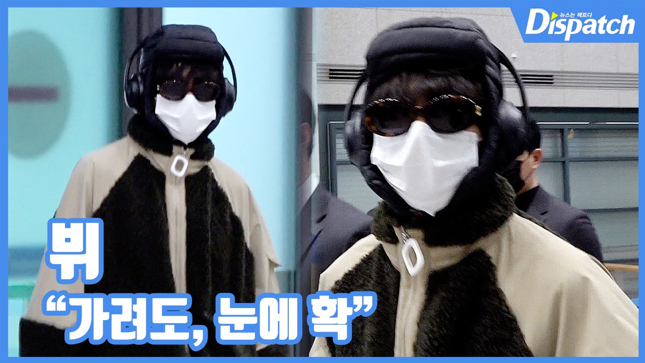 이날 뷔는 귀마개 방한모자에 헤드셋으로 귀여운 자태를 뽐냈다. 선글라스도 가릴 순 없는 빛나는 외모가 인상적이었다.