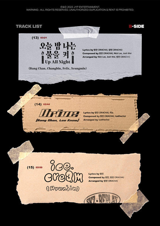 자작곡도 정식 음원으로 선보인다. 'B-사이드'에는 '존'(방찬, 창빈, 한), '클로즈'(한), '스트리트라이트'(창빈 Feat. 방찬), '인정하기 싫어'(방찬), '아이 갓 잇'(한), '꼬마별'(현진) 등을 담았다.
