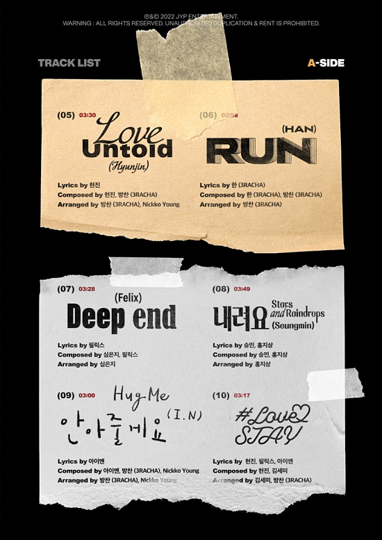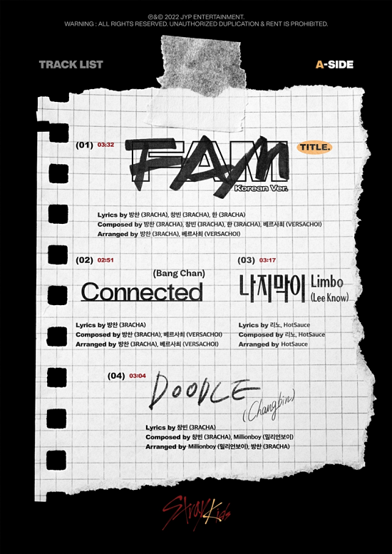 멤버들이 직접 작사, 작곡에 참여한 솔로 신곡이 8개 담겼다. 먼저, 'A-사이드'에는 '커텍티드'(Connected, 방찬)가 담겼다. 운명적인 연결을 방찬만의 감성으로 풀어냈다.