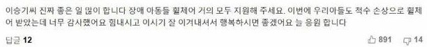 이와 관련, 한 네티즌이 해당 기사 댓글란에 "이승기 씨 진짜 좋은 일 많이 한다"며 "장애 아동들 휠체어 거의 모두 지원해 준다"고 적어 눈길을 끌었는데요.