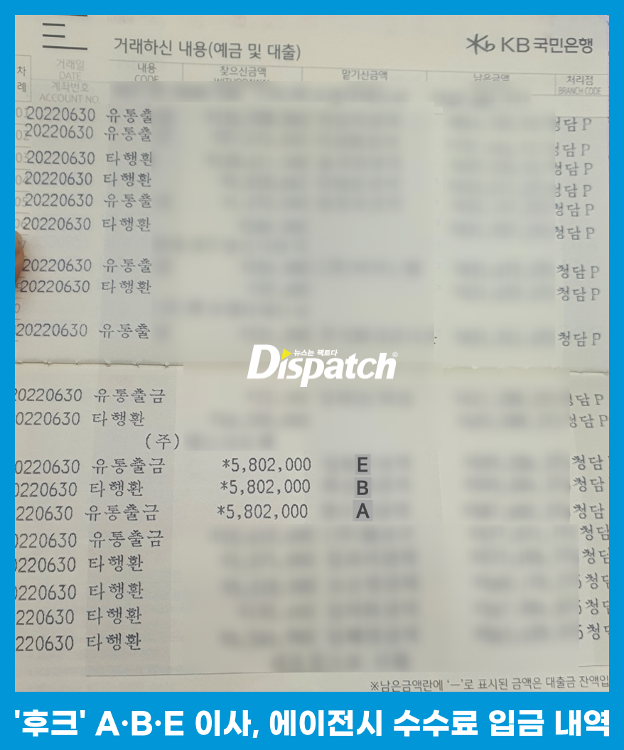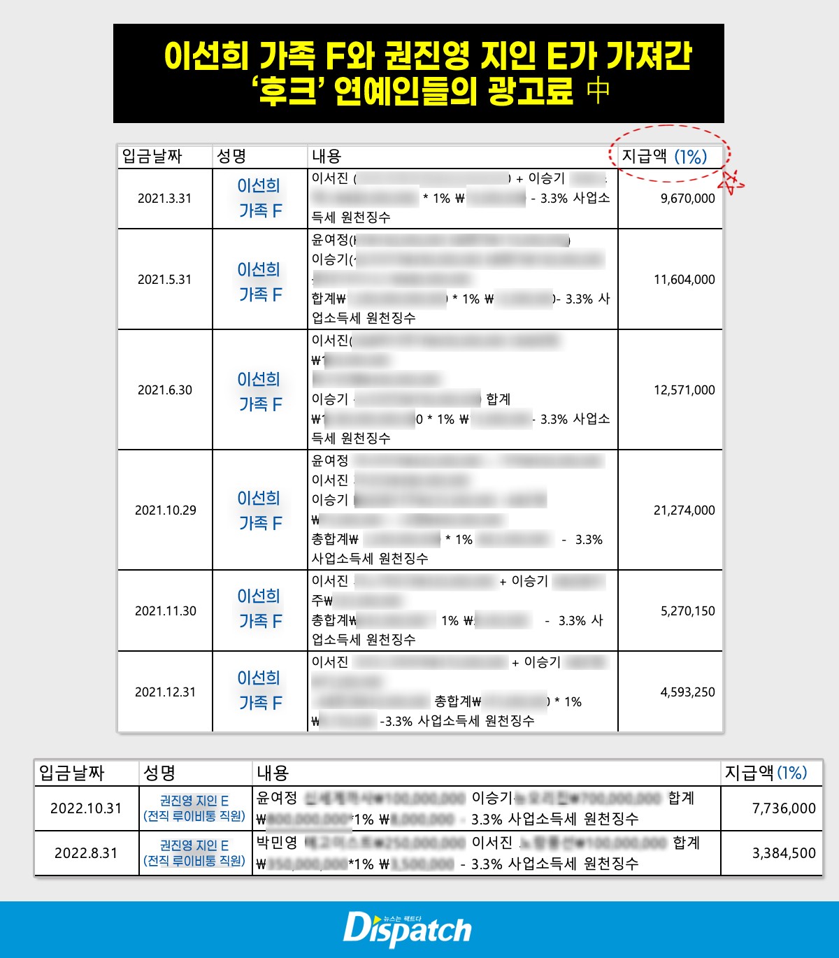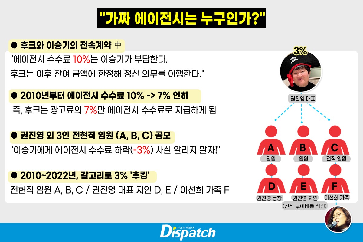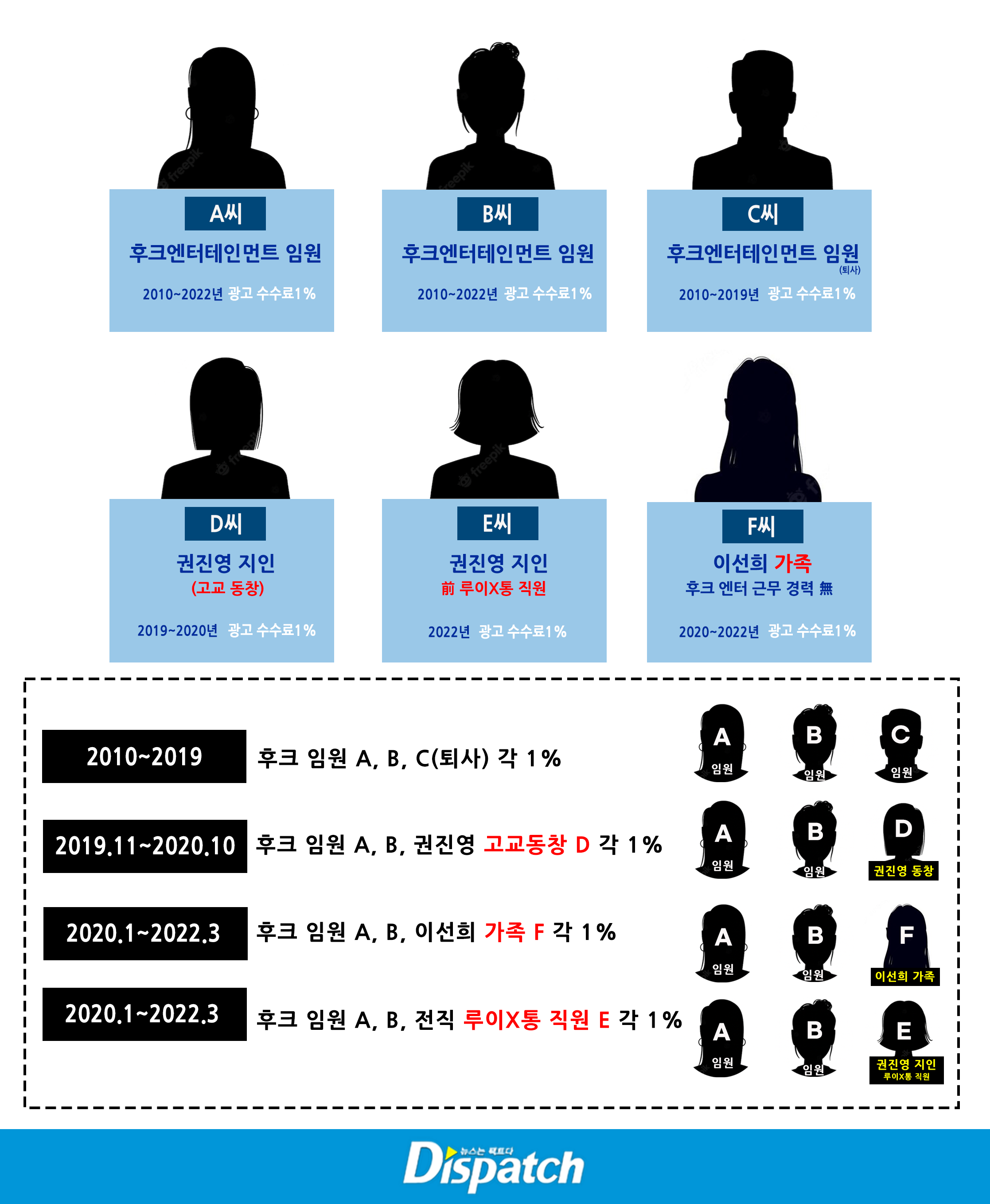 '디스패치'는 가짜 에이전시 비용을 추적했다. 후크의 전현직 임원 A, B, C, 권진영 대표의 지인 D와 E, 이선희 가족 F가 눈먼 돈을 챙긴 것으로 파악된다.