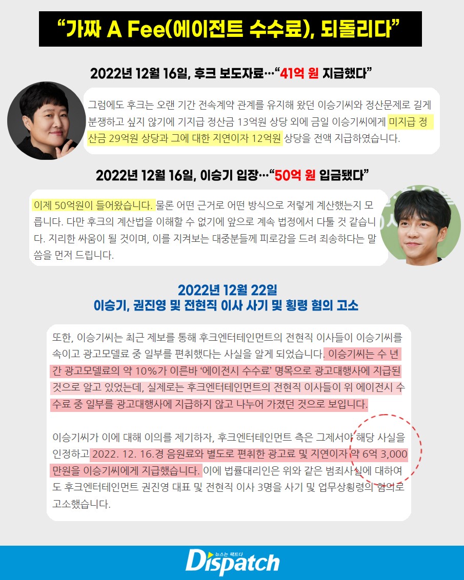 '디스패치' 확인 결과, 후크는 아티스트 모델료에서 10%를 에이전시 수수료 명목으로 뗐다. 그러나 대행사에 실지급한 수수료는 7%였다.