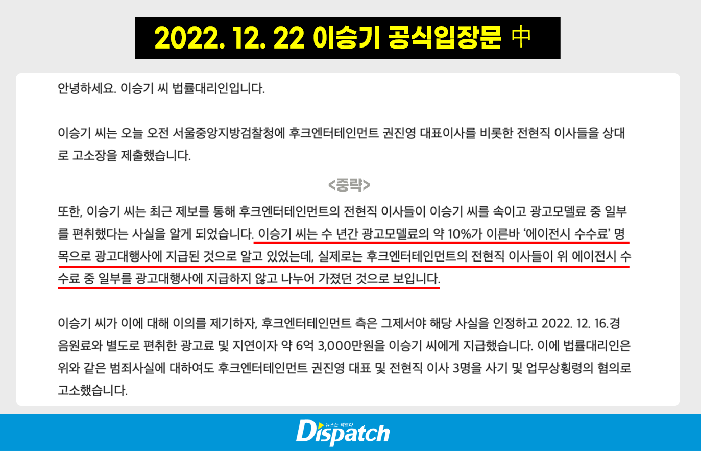 "후크는 12월 16일, 음원료와 별도로 <편취한 광고료 및 지연이자 약 6억 3,000만 원>을 이승기 씨에게 지급했습니다. 이에 법률 대리인은 위와 같은 범죄사실에 대하여도… 고소했습니다."
