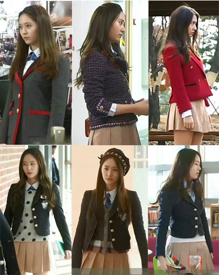 제국고의 교복은, 10대들에겐 로망이다. 사복을 더해 자유롭게 스타일링을 할 수 있기 때문이다. 크리스탈은 이점을 최대한 활용해 럭셔리한 프레피룩을 완성했다. 블라우스에 타이, 스커트를 기본으로 두고 다양한 디자인과 색깔로 여러가지 스타일을 선보였다. 교복을 사복처럼 입고 패션으로 부각시킨 것.