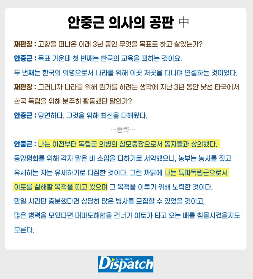 안중근 : (총을 쏜) 순간에도 누가 이토인지 분명히 알 수는 없었다. 그래서 맨 앞에 가는 사람을 향해 병사들 사이에서 쐈다. 하지만 혹시라도 그 자가 이토가 아닐 수 있다는 생각에, 그 뒤에 따라오는 두 세 사람을 겨눠 두세 발 정도를 더 쏘았다.