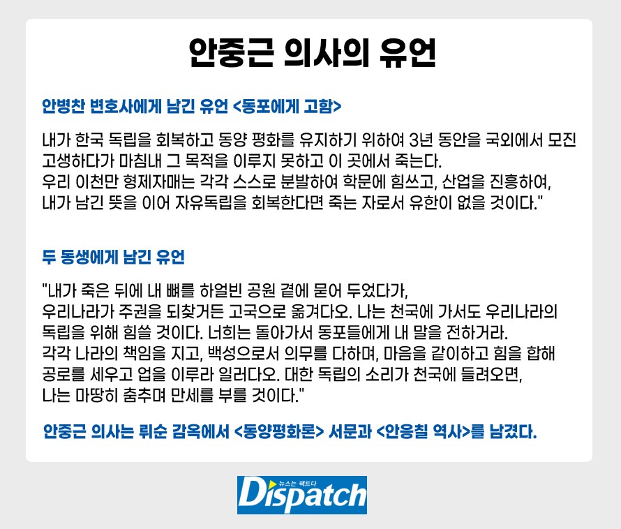 비하인드 추가. 안중근 의사는 동포들에게도, 동생들에게도, 각각 유언을 남겼다. 한국인 변호사 안병찬에게 "제 말을 기억했다가 동포들에게 꼭 전해달라"고 당부했다.