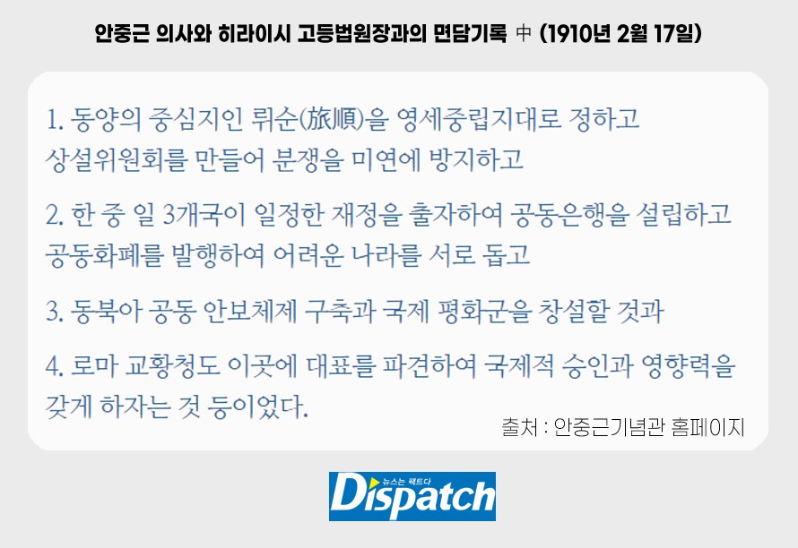 안중근 의사는 근본적으로 평화주의자였다. 제국주의와 일본의 침략전쟁에 반대했다. 인간 존중과 인류 공동 번영을 목표로 진보적인 제안들을 했다.