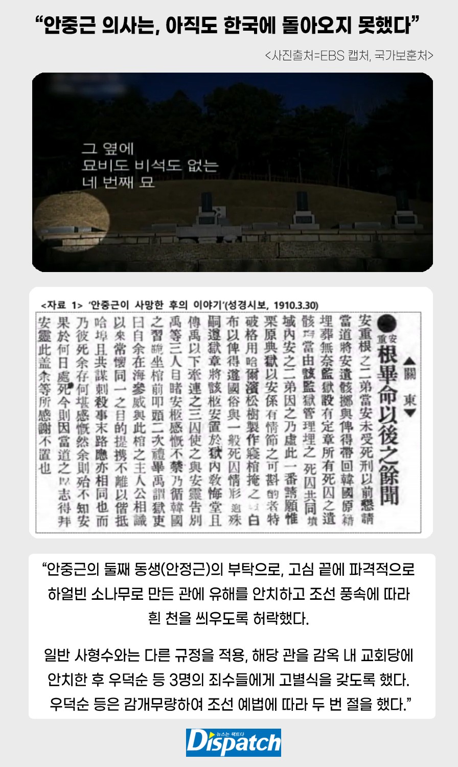 그러나 최근 의미있는 팩트가 나왔다. 국가보훈처가 지난 10월, 옛 만주지역 신문 '성경시보'의 1910년 3월 30일자 기사를 공개했다. 형무소장이 하얼빈산 소나무로 만든 관에 안 의사의 유해를 안치하고 흰 천을 씌우도록 허락해줬다는 내용이 담겼다.