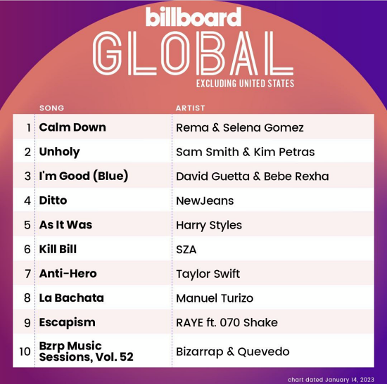 빌보드는 10일 공식 SNS에 최신 차트 순위를 공개했다. 뉴진스는 싱글앨범 ‘OMG’의 수록곡 ‘디토’(Ditto)로 주요 글로벌 차트 톱 10에 진입했다.