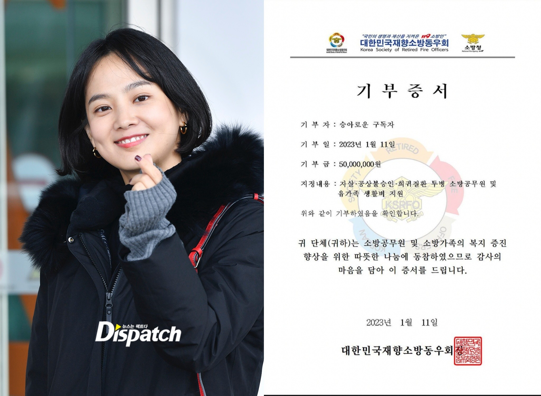 기부 증서도 공개했다. 윤승아는 유튜브 구독자들의 이름으로 소방 공무원 및 소방가족의 복지 증진 향상을 위해 5,000만 원을 기부했다.