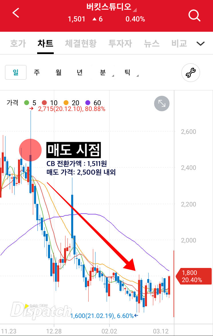 2020년 12월 14일. 강종현은 33만 주를 2,500원 내외에서 (알차게) 매도했다. 그리고 버킷스튜디오의 주가는, 그날 이후 1,600원까지 수직 낙하했다.