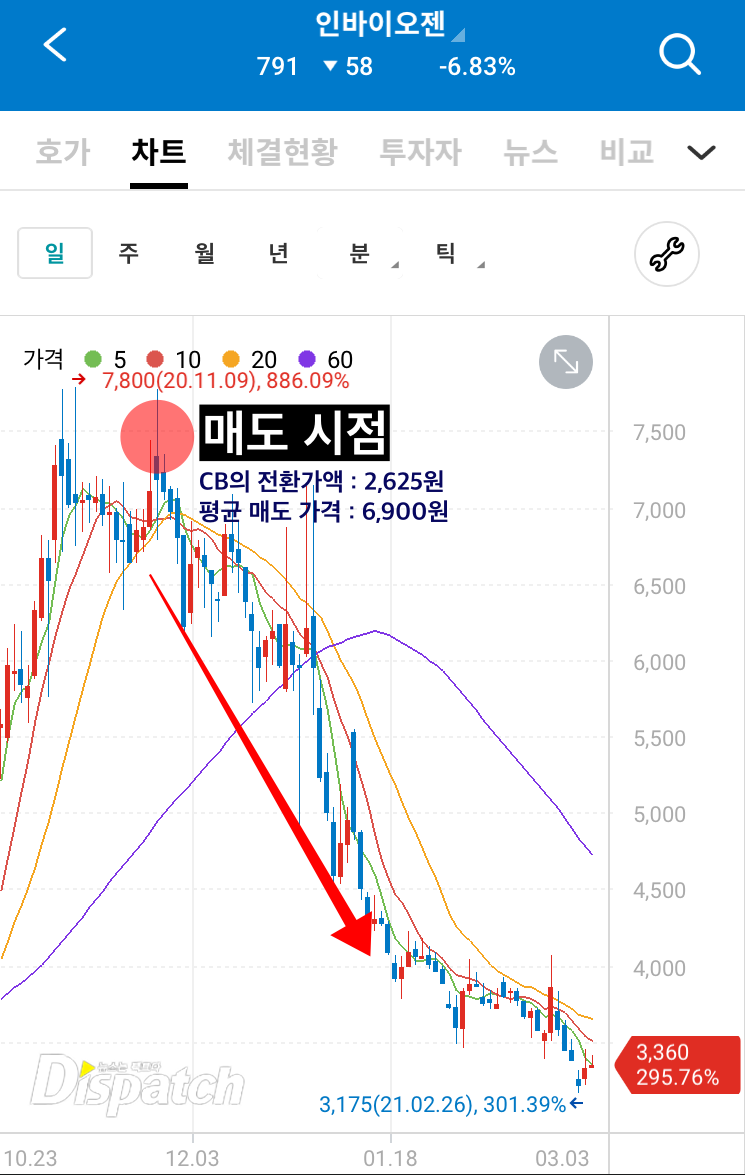 2020년 11월에 7,800원을 찍었다. 강종현은 역사적 고점에서 '마귀'처럼 털었다. 인바이오젠 주가는 그 이후 끝없이 추락했다. 2021년 2월 말, 3,175원까지 떨어졌다.