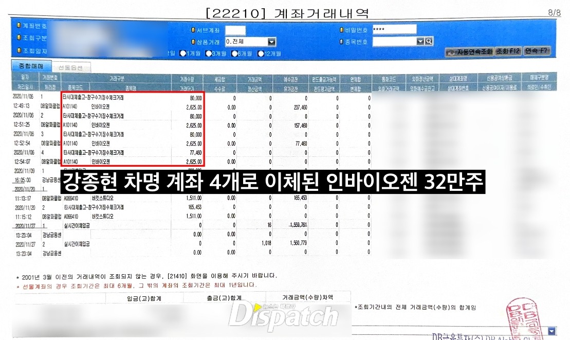 (A씨의 경우 강종현의 명령으로 차명계좌 7개를 만들었다. KB증권 4개, 동부증권 1개, NH증권 2개. 디스패치는 이 7개를 통틀어 강종현의 차명계좌로 표기했다.)