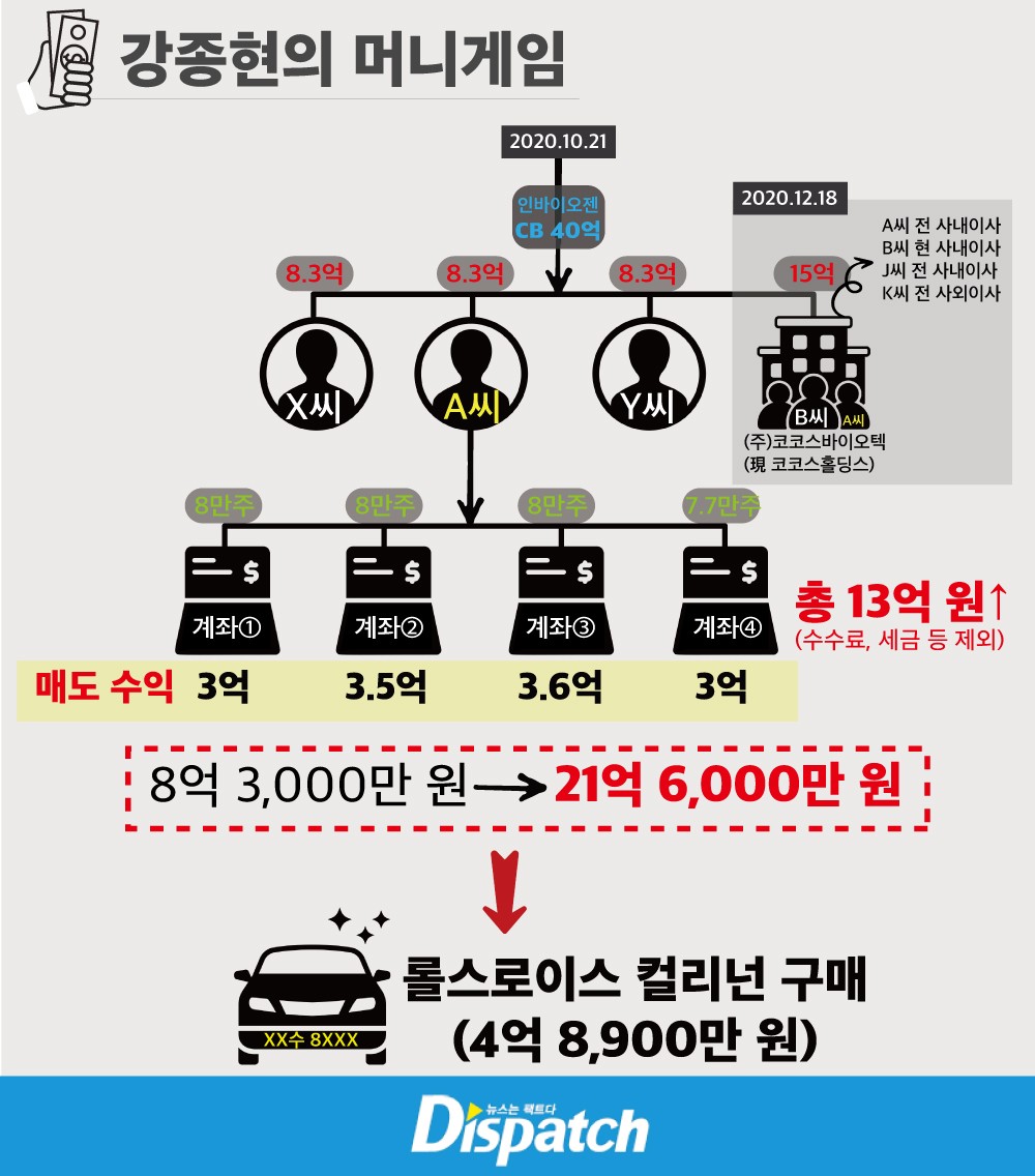 ‘디스패치’가 강종현의 차명계좌 7개를 입수했다. 강종현은 (여동생) 상장사 CB를 사고팔며 주머니를 채웠다. 그 돈으로 롤스로이스 컬리넌도 샀다.