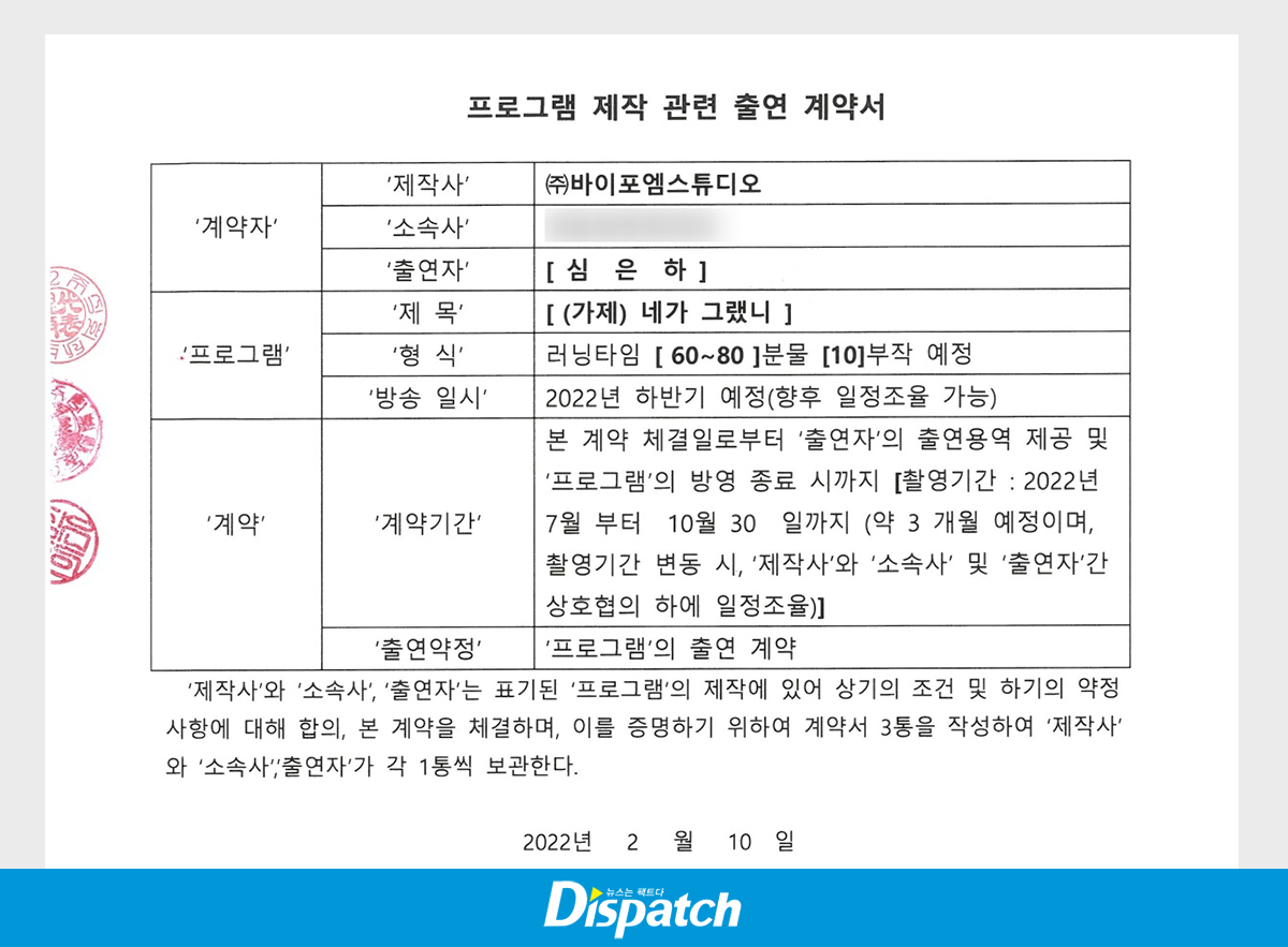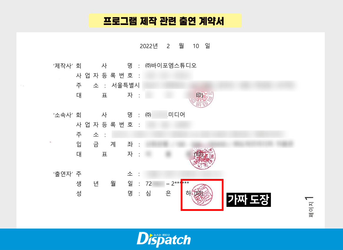 '디스패치'는 바이포엠과 D미디어가 작성한 계약서를 입수했다. 도장 3개가 찍혀 있었다. 바이포엠과 D미디어 법인 도장, 그리고 심은하 가짜 도장.