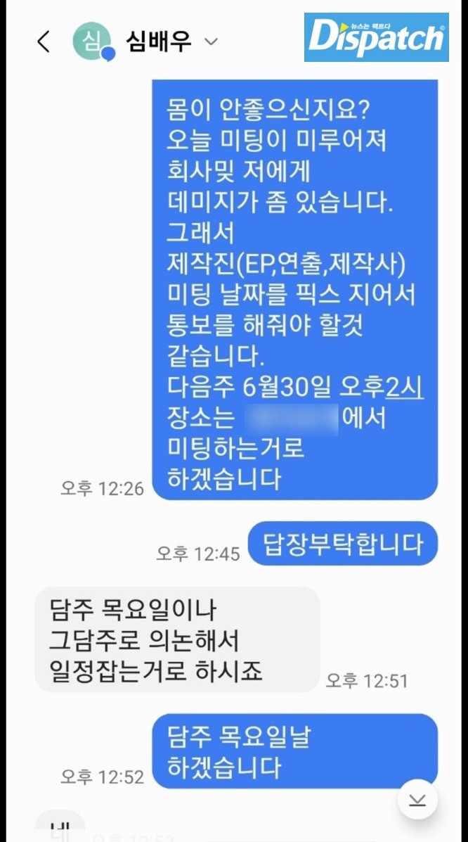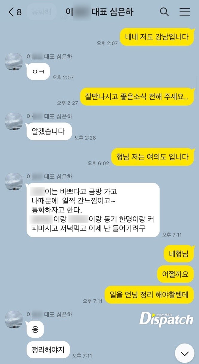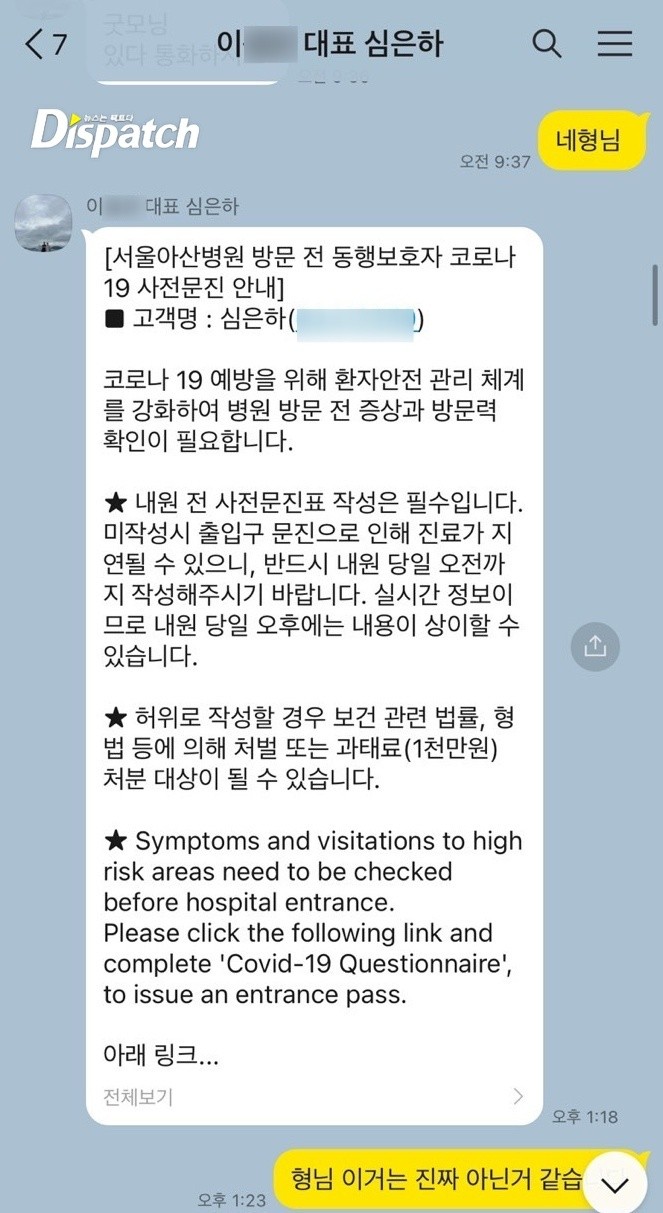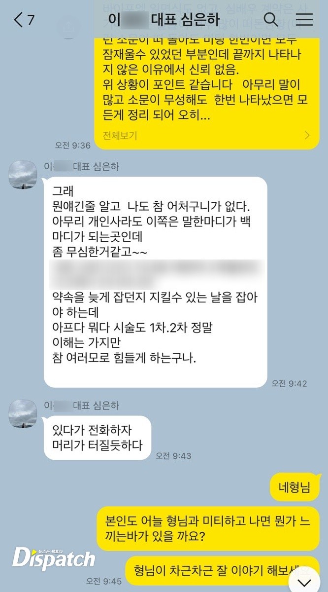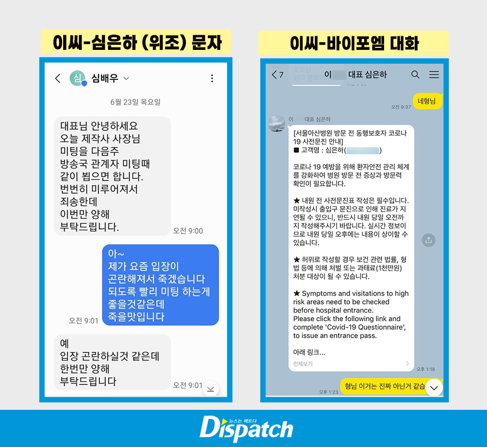 '디스패치'는 이 씨와 심은하가 주고받은 (가짜) 문자, 이씨가 바이포엠에 전달한 (조작) 문자를 확인했다. 심은하와의 대화는 연출이었고, 병원 예약은 위조였다.