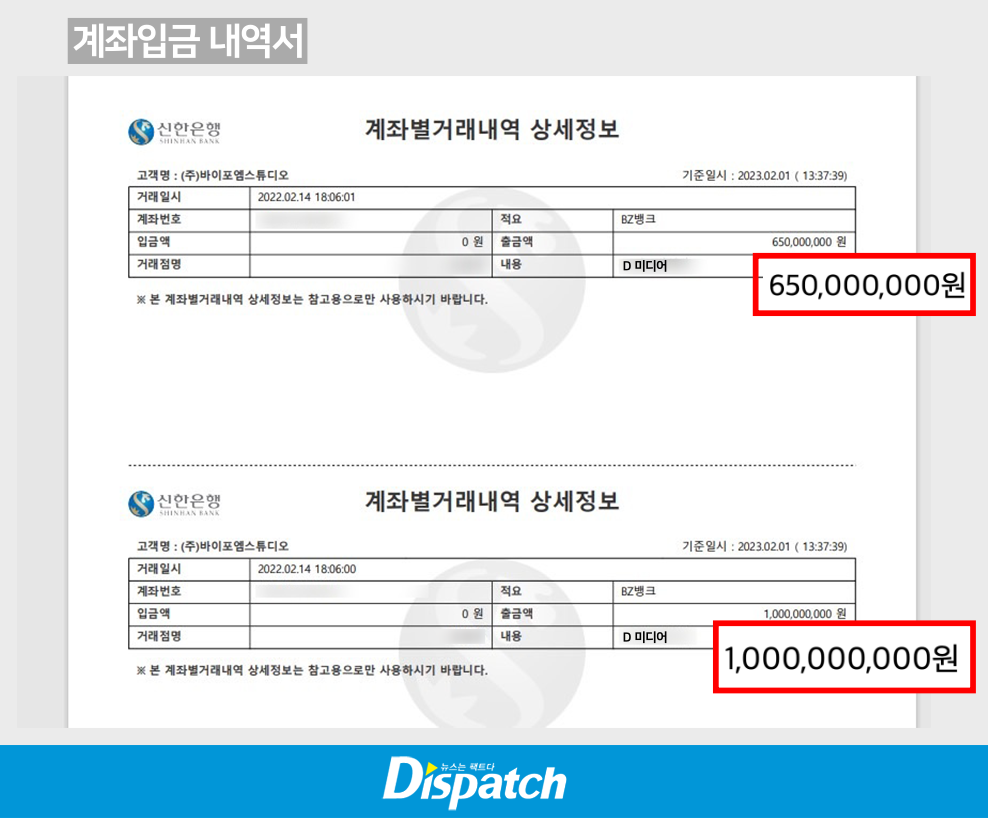 계좌별 거래내역 정보도 확인했다. 보내는 사람은 (주) 바이포엠스튜디오. 받는 사람은 D미디어였다. 10억 원과 6억 5,000만 원을 2번에 나눠 보냈다.